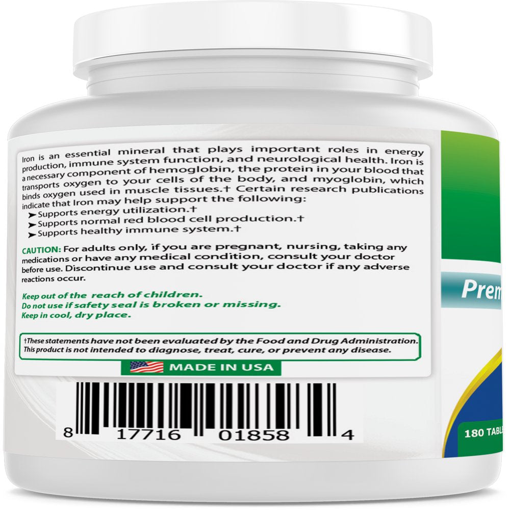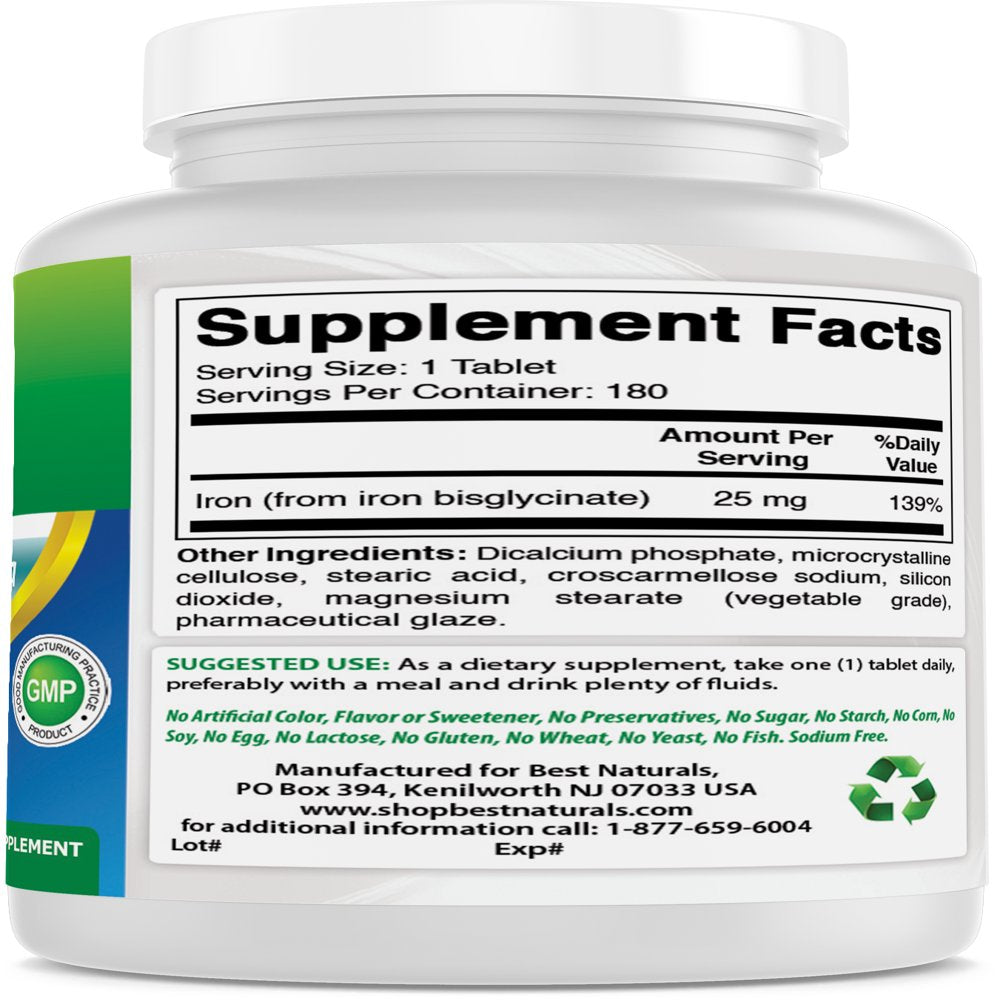 Best Naturals Iron Supplement (Iron Bisglycinate) - 25Mg - 180 Tablets - Gentle of Stomach - Non-Constipating