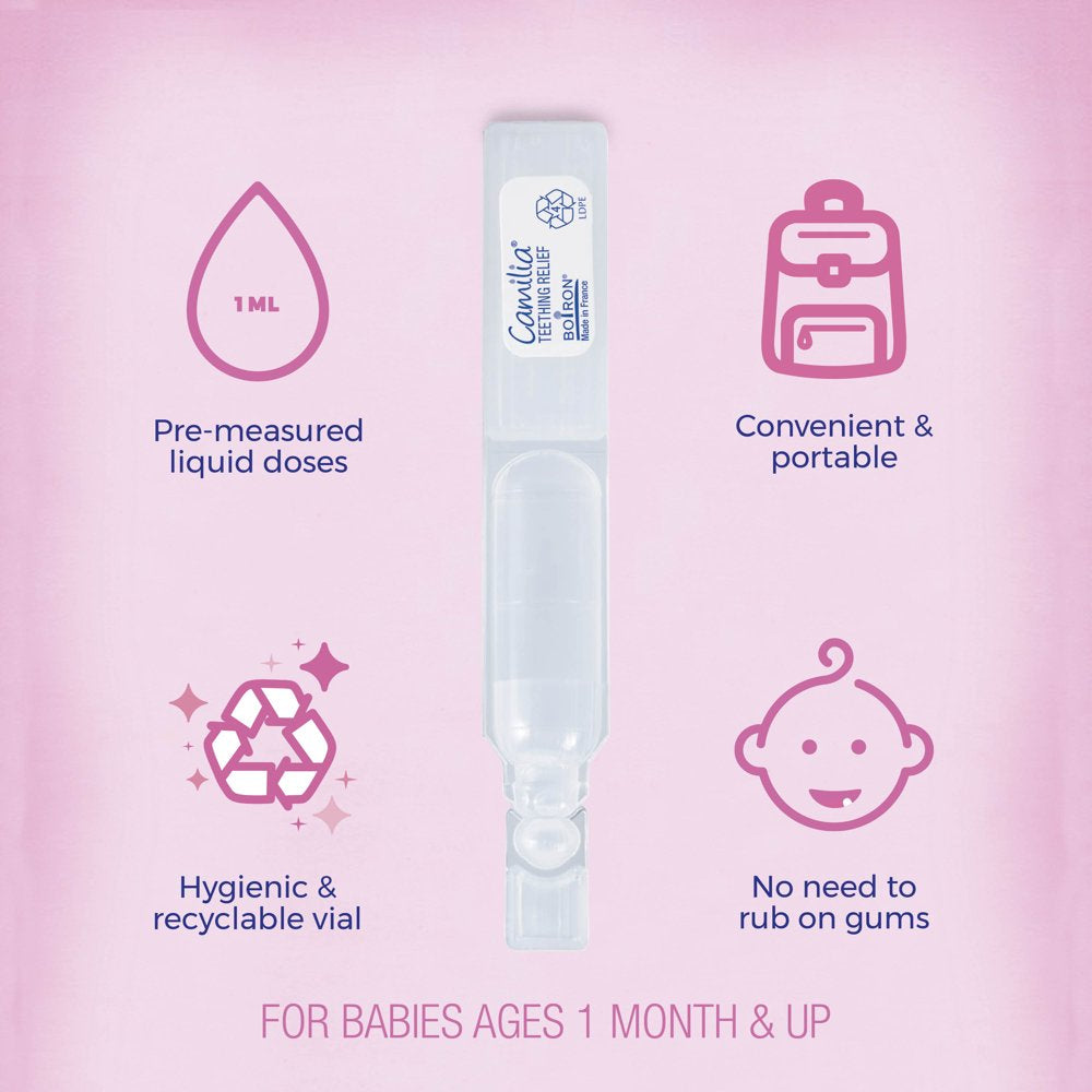With Camilia, teething relief is just a squeeze away. This worry-free, plant-based homeopathic medicine relieves painful gums, irritability, and minor digestive upsets sometimes associated with teething.* Camilia is offered in pre-measured liquid doses that are hygienic and easy to use. The liquid dose vials are also sterile, recyclable, and small enough to carry anywhere. (CamiliaTeething.com) *Claims based on traditional homeopathic practice, not accepted medical evidence. Not FDA evaluated.