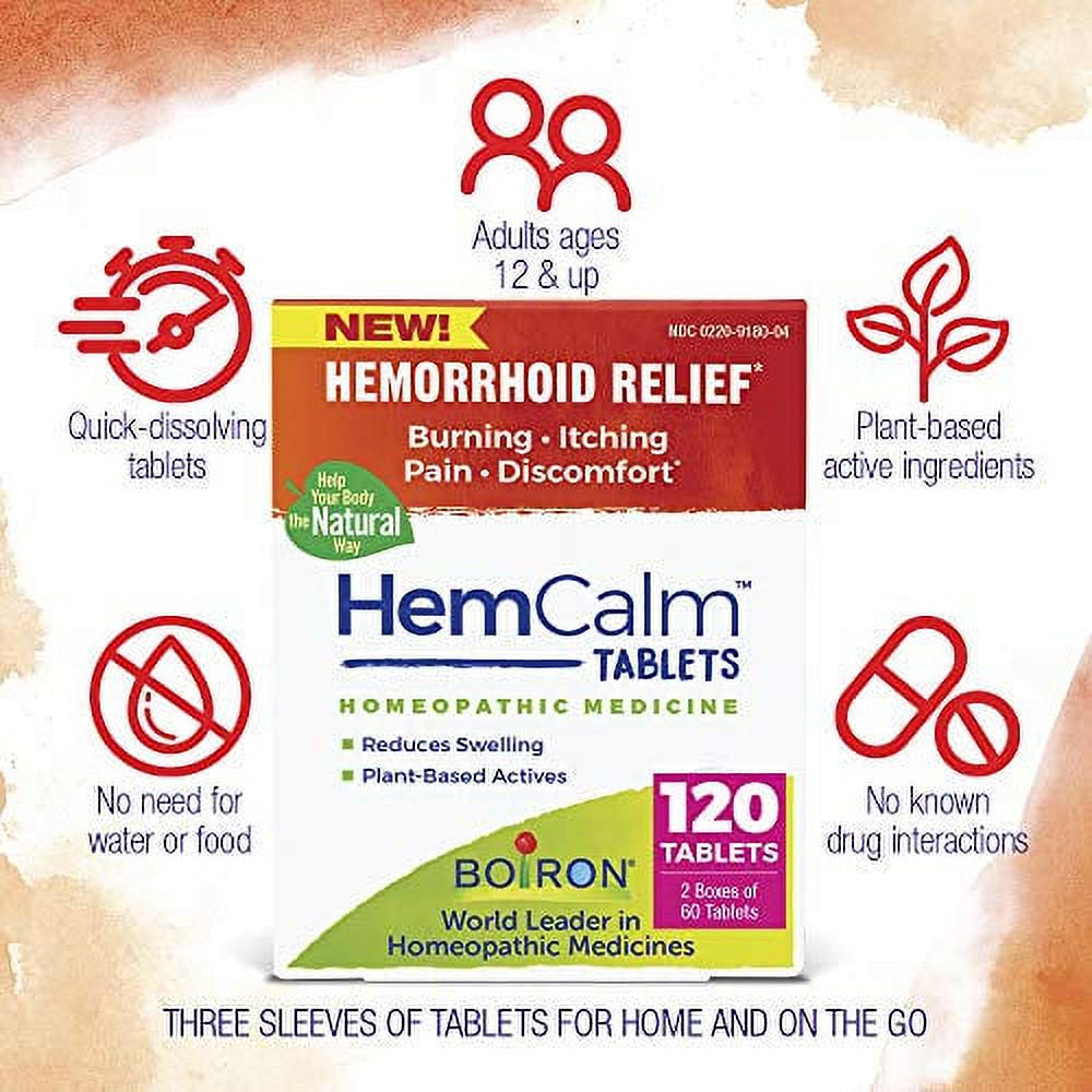 Boiron HemCalm Tablets for Hemorrhoid Relief of Pain, Itching, Swelling or Discomfort - 120 Count (2 Pack of 60)