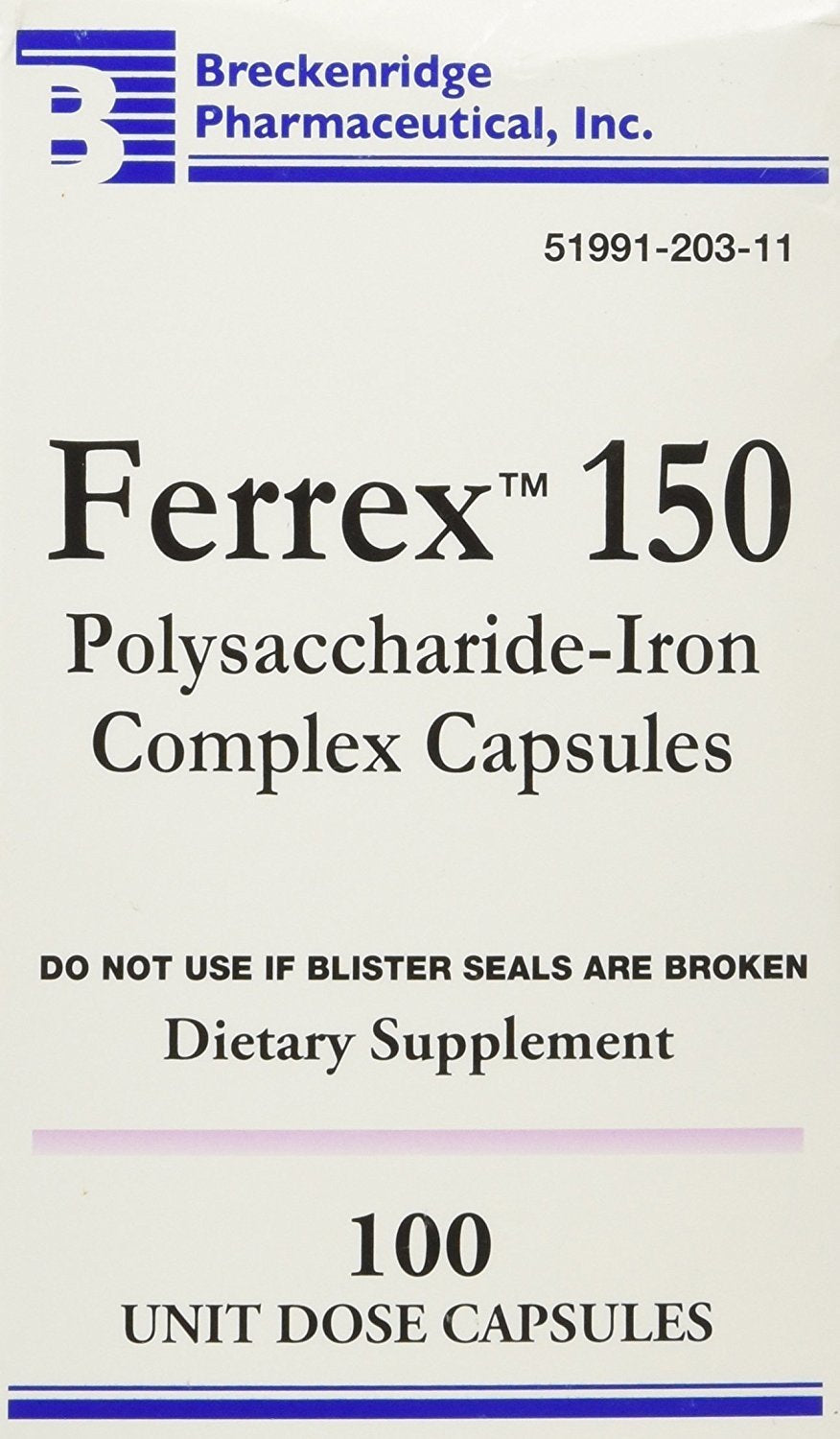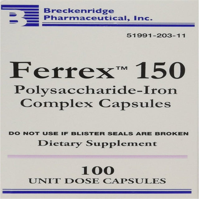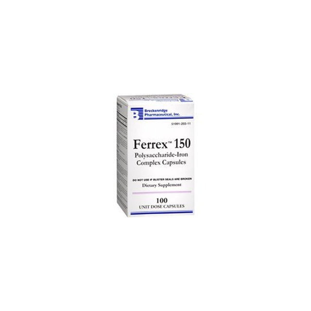 Pack of 2 for the UPC: 351991203018Ferrex 150 mg polysaccharide iron complex capsules by Breckenridge It used to prevent and treat iron deficiency. FERREX-150. 18099 Ferrex -150 Capsules are exactly as directed on the package, unless instructed differently by your doctor. It is absorbed better on an empty stomach but may be taken with food if it upsets your stomach. Do not take it within 1 hour before or 2 hours after antacids, eggs, whole grain breads, cereal, milk products, tea or coffee. Take Capsules with a full glass (8 oz. /240 ml) of water. Do not lie down for 30 minutes after taking this medicine. Store this medicine at room temperature in a tightly-closed container, away from heat and light. If you miss a dose of this medicine, skip the missed dose and go back to your regular dosing schedule. Do not take 2 doses at once. Follow the dietary plan provided by your doctor. Do not share this medicine with others for whom it was not prescribed. Do not use this medicine for other health conditions. Keep this medicine out of the reach of children. If using this medicine for an extended period of time, obtain refills before your supply runs out. 100 Non Blistered Capsules Usual adult dosage is one or two capsules daily, or as directed by a M.D. Treats iron deficiency
