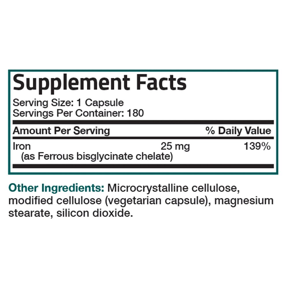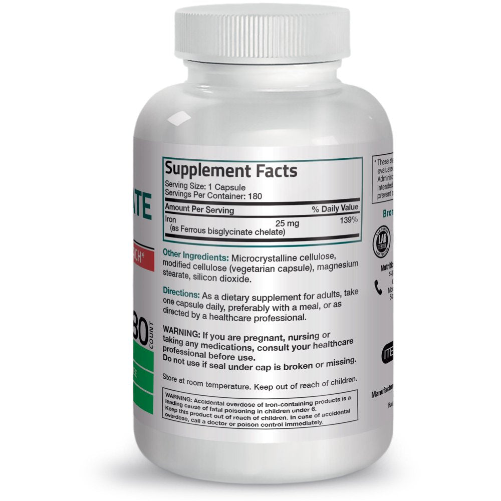Bronson Iron Bisglycinate 25 Mg Gentle on the Stomach, Supports Energy & Healthy Red Blood Cell Production - Non-Constipating Formula - Non GMO, 180 Vegetarian Capsules