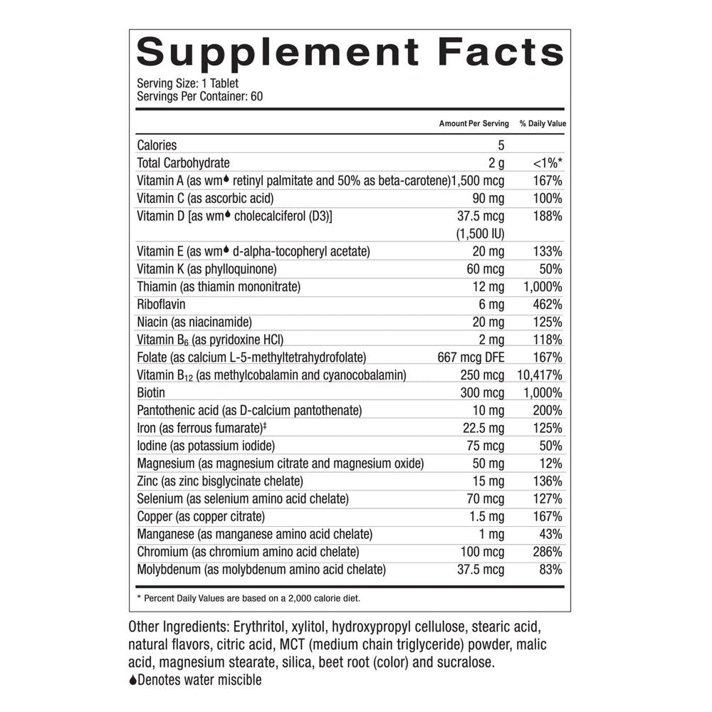- Bariatric multivitamin with 21 key vitamins and minerals plus 45 mg of iron