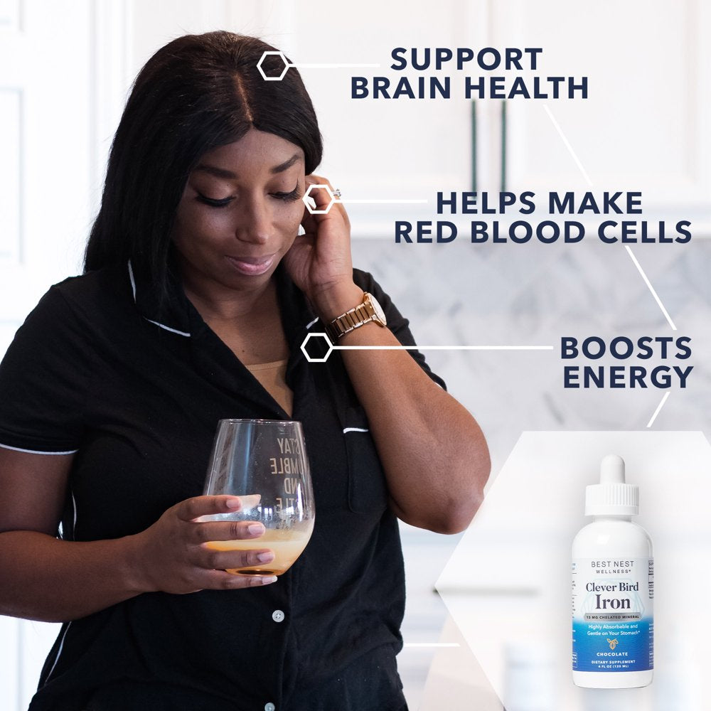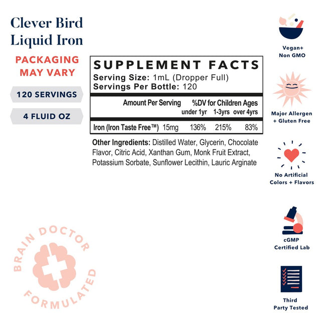 Clever Bird Liquid Iron Supplement - 15Mg per Serving, 4 Oz Vegan Iron Supplements Drops for Kids and Adults, Chocolate Flavor Iron Vitamin, High Potency, Non-Gmo Formula, by Best Nest Wellness