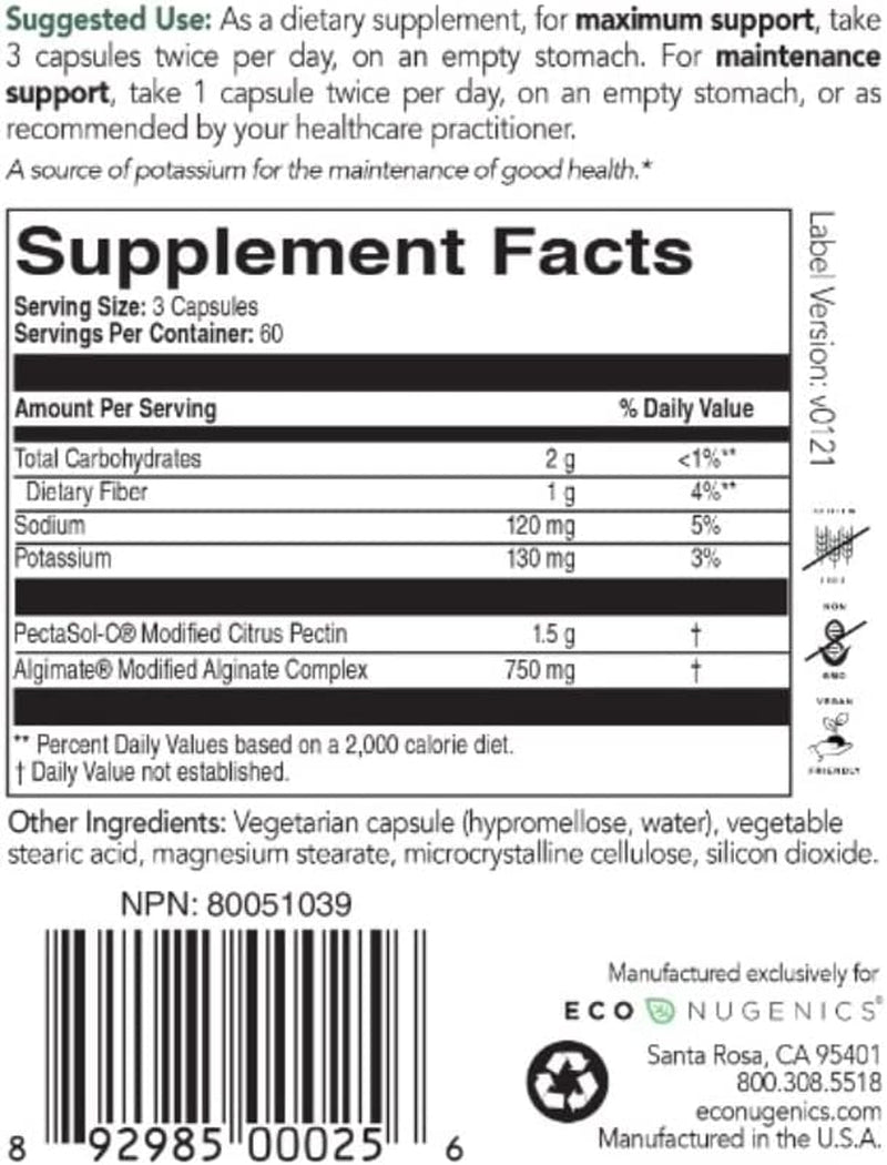 Ingredients: PectaSol Modified Citrus Pectin, Algimate Modified Alginate Complex. Vegetable capsule (natural vegetable cellulose, water), stearic acid, magnesium stearate, microcrystalline cellulose, silicon dioxide.
