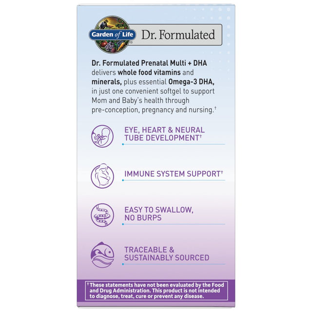 Mom’s health and Baby’s development are the highest priority during this exciting time. Garden of Life Dr. Formulated Prenatal Multivitamin + DHA supports Mom and Baby’s health through pre-conception, pregnancy, and nursing.† This formula delivers super critical nutrients like folate and iron, plus 400mg of essential Omega-3 DHA in just one easy-to-swallow softgel. Dr. Formulated Prenatal Multivitamin + DHA is full of whole food vitamins and minerals that are clean, Non-GMO Project Verified and sustainably-sourced MSC Certified.