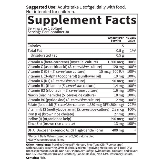 DHA (Docosahexaenoic Acid) Triglyceride Form. Other Ingredients: PureSeaOmega3 Mercury Free Tuna Oil (Thunnus spp.) with naturally occurring SPMs (Specialized Pro-Resolving Mediators) and Total DPA (Docosapentaenoic Acid), Non-GMO PlantGel Softgel (with natural colorant, and flavor), Non-GMO Sunflower (Oil and Lecithin), Candelilla Wax, Non-GMO Rosemary Extract./div>