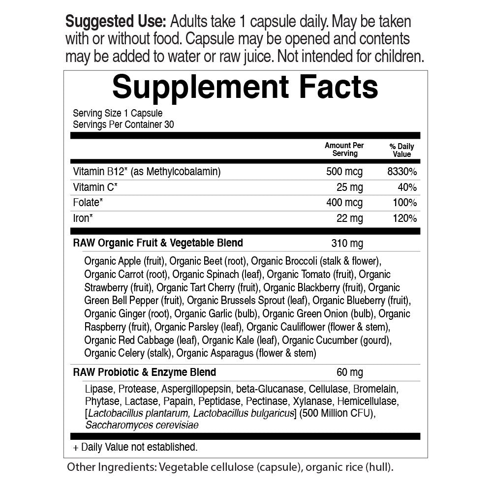 Made with individually grown nutrients utilizing probiotic cultivation to produce RAW Food-Created Nutrients?, Vitamin Code supplements are delivered in a whole food base of fruits and vegetables. Vitamin Code supplements are RAW, which not only means that they are produced below 115º F, but also means that these nutrients come with their natural cofactors, along with live probiotics and enzymes, just like raw foods! Vitamin Code raw powders are delivered in capsules without any binders or fillers?everything you want and nothing you don?t want. Vitamin Code RAW Iron is whole food nutrition, specifically formulated with 22mg of gentle, whole food iron. RAW means no high heat, synthetic binders or fillers, artificial flavors, sweeteners, colors or additives commonly used in tablets. Whole food means RAW Food- Created Nutrients are blended in a base of 23 fruits and vegetables together with food cofactors.