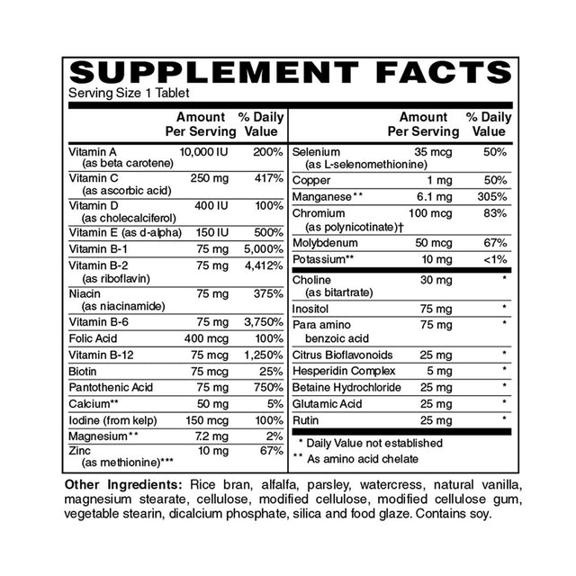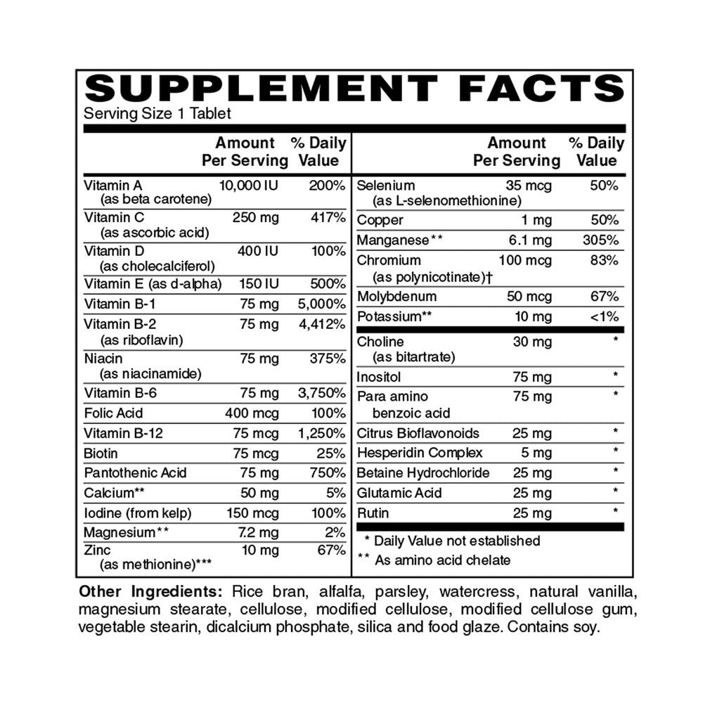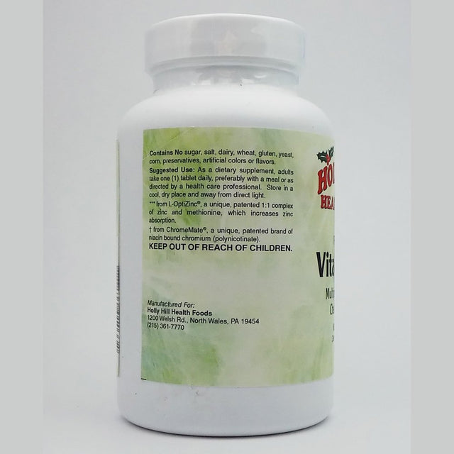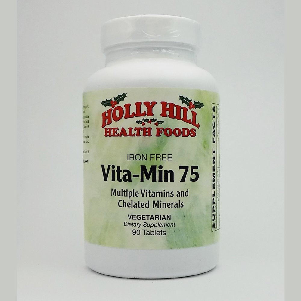 Holly Hill Health Foods, Iron Free Vita-Min 75, Multivitamin for Everyone, 90 Tablets. Often times it is difficult to meet the recommended daily requirements for all essential nutrients. Taking a comprehensive multivitamin mineral formula on a daily basis is one way to ensure you receive all of the essential vitamins and minerals that are critical for maintaining health and wellness. Our Vita-Min 75 is a comprehensive high-potency multivitamin/mineral formula which provides high levels of most essential nutrients including the B-complex vitamins as well as vitamins A, C, D and E. This formula includes patented and trademarked ingredients, all of which are backed by scientific studies demonstrating their efficacy and safety