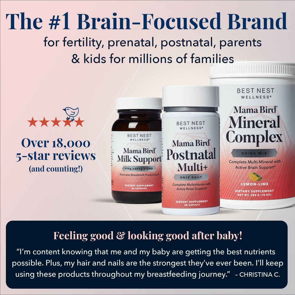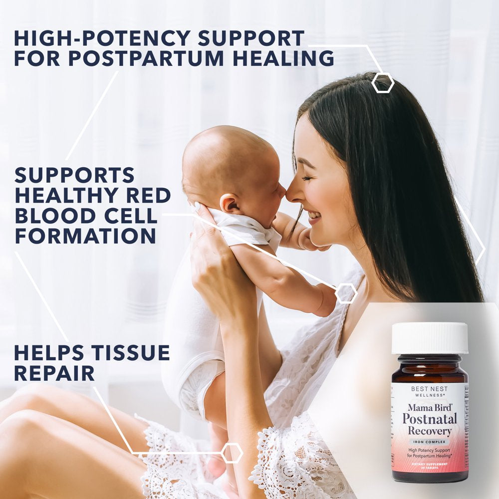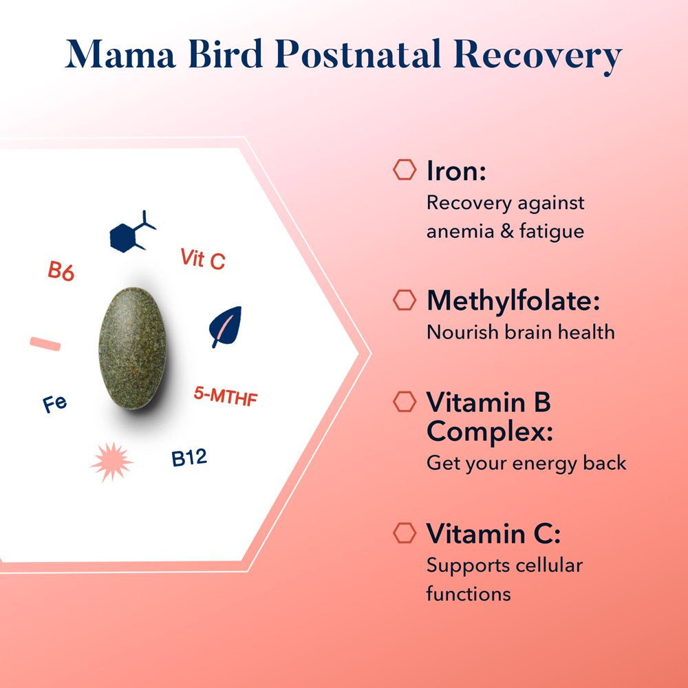 Sometimes, your body needs a little extra support post-birth. We developed Mama Bird Recovery so you can get your iron levels back up, feel more energy, and help repair the tissues that were damaged during the birthing process.Taking good care of yourself is good for you and good for your baby. Because it’s easier to meet your little one’s needs when your cup is full. Mama Bird Postnatal Recovery is a multivitamin formulated to help you recover beautifully after giving birth. Convenient once-daily formula.Natural, vegan tablet. Gentle and non-constipating form of iron. Get your energy back with the vitamin B complex. Fight fatigue with high-potency iron. Nourish your brain health with methylfolate. Beat stress and balance your mood with vitamins D3 and B12.