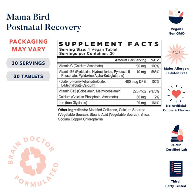 Mama Bird Postnatal Recovery, Once Daily, Replenish with Iron, L-Methylfolate (Folic Acid), Methylcobalamin (B12), Natural Vitamin, Repair and Support, 30 Ct