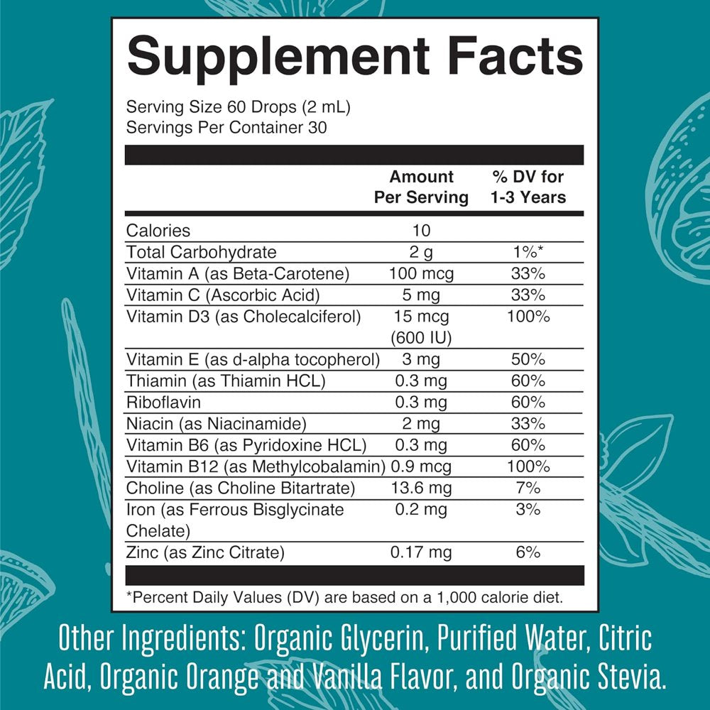 - Vegan Formula: Vitamin A, Vitamin C, Vitamin D3, Vitamin E, Thiamin, Riboflavin, Niacin, Vitamin B6, Vitamin B12, Choline, Iron, Zinc, Organic Glycerin, Purified Water, Citric Acid, Organic Orange and Vanilla Flavor, and Organic Stevia.