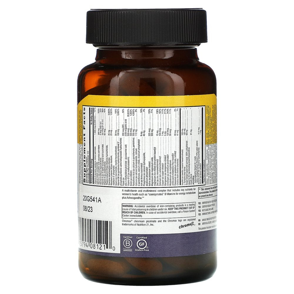 Established 1971 Certified Gluten-Free Includes Ashwagandha Includes Coenzyme B Vitamins Only 2 Tablets Daily Dietary Supplement Chromax® Certified B Corporation Certified Gluten-Free — Our Pledge of Integrity — Authenticity Cleanliness Freshness Consistency Accuracy A multivitamin and multimineral complex that includes key nutrients for women's health such as "coenzymated" B Vitamins for energy metabolism plus Ashwagandha. YES Certified Gluten-Free by GFCO.org NO Wheat, Milk Soy or Preservatives YES Certified Vegan by the AVA NO No Artificial Colors, Flavors or Sweeteners YES Recyclable Packaging YES Manufacturing Supports Wind Power