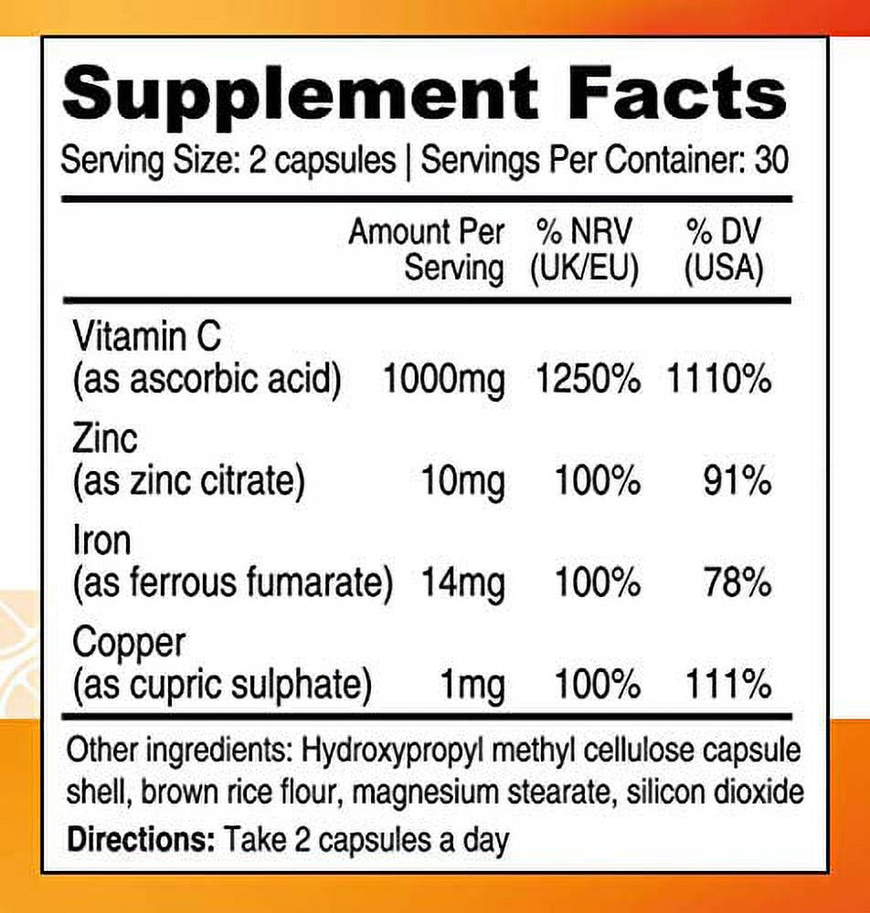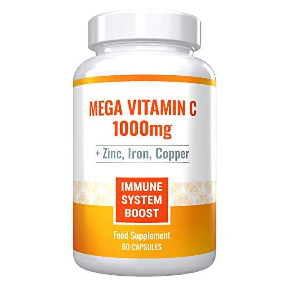 Mega Vitamin C 1000Mg plus Zinc, Iron and Copper. Powerful Immune System Boost. Sugar-Free, Gluten-Free. 60 Capsules - 1 Month Supply.