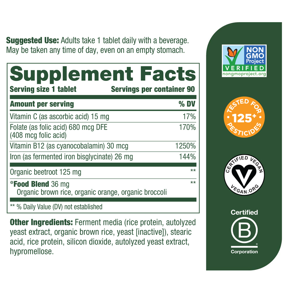 MegaFood Blood Builder iron supplement helps you combat fatigue and improves energy levels. MegaFood Blood Builder is one of our top-selling products for a reason: it’s clinically shown to increase iron levels without common gastrointestinal side effects such as constipation.We make it with nourishing, whole foods, like beets and natural oranges, plus folic acid and vitamin B12 for healthy red blood cell production, and vitamin C to support iron absorption. Oh, and did we tell you it’s safe to take on an empty stomach? If building your blood without missing a beet sounds up your alley, this is the product for you. Combats fatigue and improves energy levels. Blood Builder delivers a gentle and effective 26 mg of iron per serving. Safe for menstruating women, teenage girls, pregnant women, vegans and vegetarians, athletes, and recent blood donors, all of whom are at increased risk of being low in iron. Take one tablet daily. MegaFood exists to help grow a healthier world, and we believe better health starts with what nature provides. Plants are our power, fueling each of us with the nutrients we need to be at our best. We expertly pair vitamins and minerals with real food, and partner with farmers who share our commitment to nutrient-dense food and soil health through regenerative agriculture. We believe you are what you do, so we’re obsessed with quality. We offer product certifications like Non-GMO and Vegan, but also test for over 125 chemical substances, because things that shouldn’t be in your body, shouldn’t be in our products. From our farmers to our employees to you, we’re about doing things the way we believe is the right way to help people thrive. It's part of what being a B Corporation is all about.