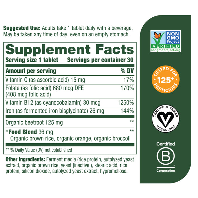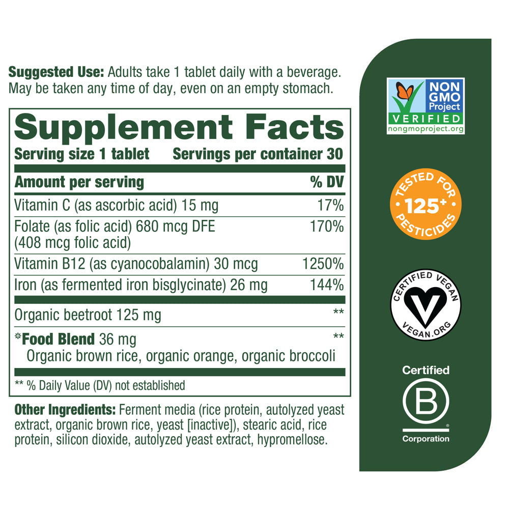MegaFood Blood Builder iron supplement helps you combat fatigue and improves energy levels. MegaFood Blood Builder is one of our top-selling products for a reason: it’s clinically shown to increase iron levels without common gastrointestinal side effects such as constipation.We make it with nourishing, whole foods, like beets and natural oranges, plus folic acid and vitamin B12 for healthy red blood cell production, and vitamin C to support iron absorption. Oh, and did we tell you it’s safe to take on an empty stomach? If building your blood without missing a beet sounds up your alley, this is the product for you. Combats fatigue and improves energy levels. Blood Builder delivers a gentle and effective 26 mg of iron per serving. Safe for menstruating women, teenage girls, pregnant women, vegans and vegetarians, athletes, and recent blood donors, all of whom are at increased risk of being low in iron. Take one tablet daily. MegaFood exists to help grow a healthier world, and we believe better health starts with what nature provides. Plants are our power, fueling each of us with the nutrients we need to be at our best. We expertly pair vitamins and minerals with real food, and partner with farmers who share our commitment to nutrient-dense food and soil health through regenerative agriculture. We believe you are what you do, so we’re obsessed with quality. We offer product certifications like Non-GMO and Vegan, but also test for over 125 chemical substances, because things that shouldn’t be in your body, shouldn’t be in our products. From our farmers to our employees to you, we’re about doing things the way we believe is the right way to help people thrive. It's part of what being a B Corporation is all about.