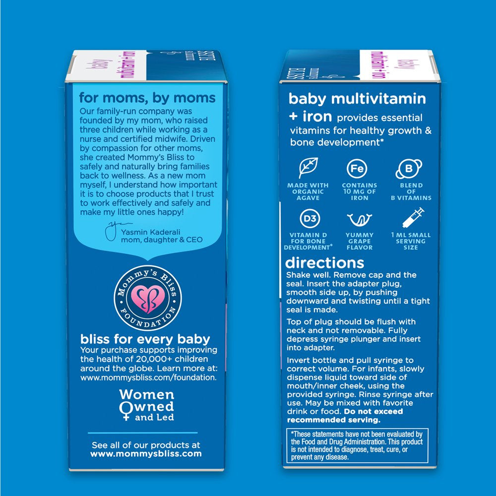 Baby Multivitamin + Iron provides essential vitamins for healthy growth & bone development. Our family-run company was founded by my mom, who raised three children while working as a nurse and certified midwife. Driven by compassion for other moms, she created Mommy's Bliss to safely and naturally bring families back to wellness. As a new mom myself, I understand how important it is to choose products that I trust to work effectively and safely and make my little ones happy!- Yasmin Kaderali mom, daughter & CEO