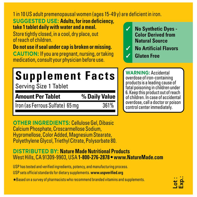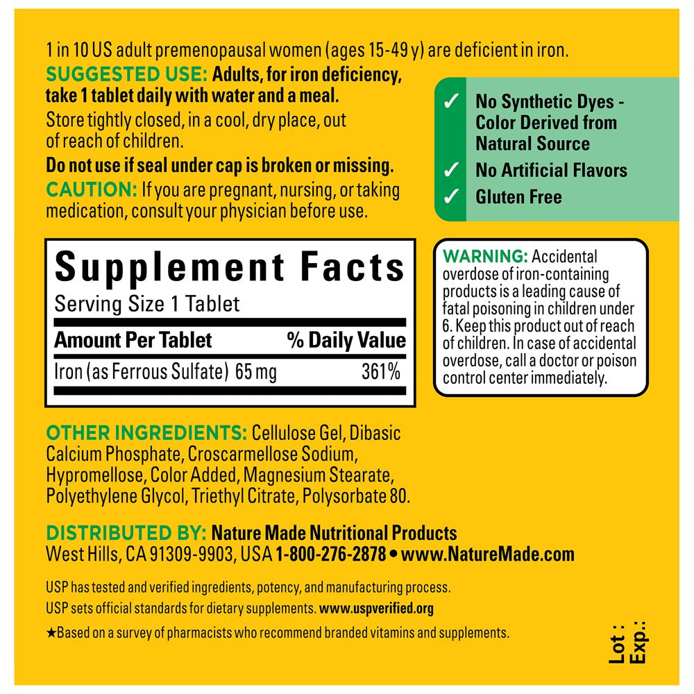 Nature Made Iron 65 mg (325 mg Ferrous Sulfate)(1) Tablets are for those with Iron deficiency and are vital for red blood cell formation. This Iron supplement also supports healthy cognitive function. Sourced from high-quality ingredients, this gluten free 65 mg Iron supplement has no synthetic dyes and no artificial flavors. These Nature Made Iron 65 mg tablets provide Iron for premenopausal women that need this essential nutrient during their reproductive years, and help support adequate Iron in the body. 1 in 10 US adult premenopausal women (ages 15-49) are deficient in Iron. Adults, for Iron deficiency, take one 65 mg Iron tablet daily with water and a meal. Start your day with Nature Made supplements. USP has tested and verified ingredients, potency, and manufacturing process. USP sets official standards for dietary supplements. Visit the USP verified website for more information. (1)Each tablet contains 65 mg elemental Iron equivalent to 325 mg ferrous sulfate heptahydrate. *Based on a survey of pharmacists who recommend branded vitamins and supplements.CAUTION: If you are pregnant, nursing, or taking medication, consult your physician before use.WARNING: Accidental overdose of iron-containing products is a leading cause of fatal poisoning in children under 6. Keep this product out of reach of children. In case of accidental overdose, call a doctor or poison control center immediately.