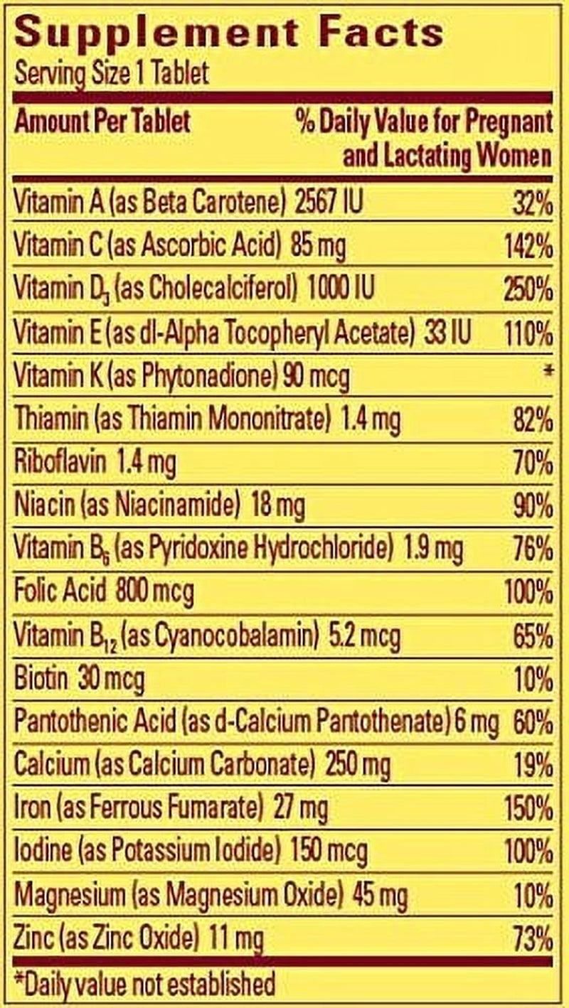 Nature Made Prenatal Multivitamin with Folic Acid Tablets are prenatal multivitamins specially formulated to support the development of a baby’s brain, nervous system, bones, and eyes while also supporting mom's health. Made in the USA with quality global ingredients, this gluten free multivitamin for women is a dietary supplement that contains no artificial flavors. This Nature Made Prenatal multivitamin supplement for women contains Folic Acid and 17 other nutrients for baby's development and mom's health, including Zinc, B Vitamins, and Vitamin A, Vitamin C, Vitamin D3, and Vitamin E. Adults take one of these prenatal multivitamin tablets daily with water and a meal. Nature Made supplements are quality you can trust. USP has tested and verified ingredients, potency and manufacturing process. USP sets official standards for dietary supplements. Visit the USP verified website for more information.