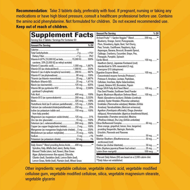 - FOOD-BASED: Premium formula blends Orchard FruitsTM, Garden VeggiesTM, Daily GreensTM, and nutrients to support bone health, daily energy, eye health, heart health, and immune health (600 mg per serving)*
