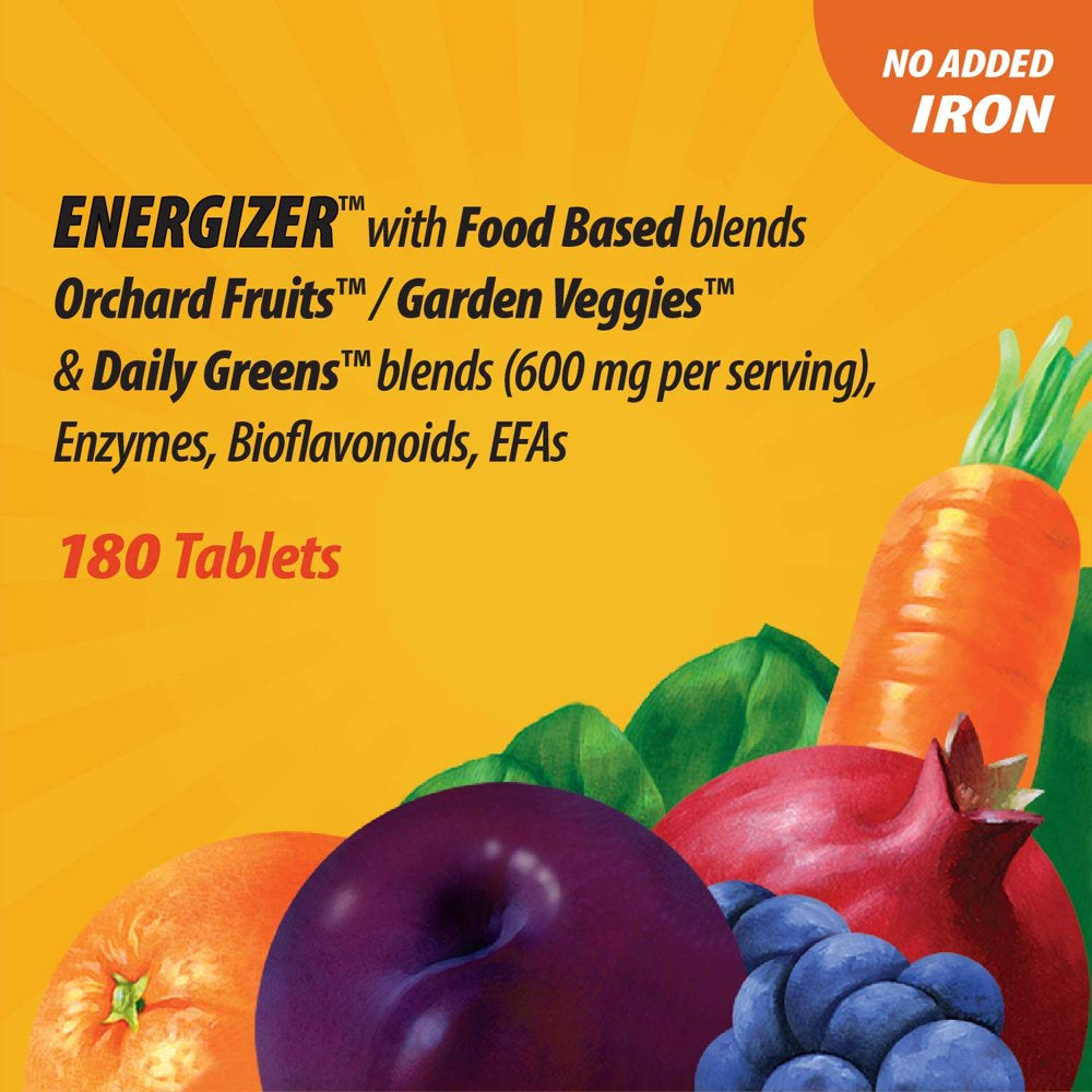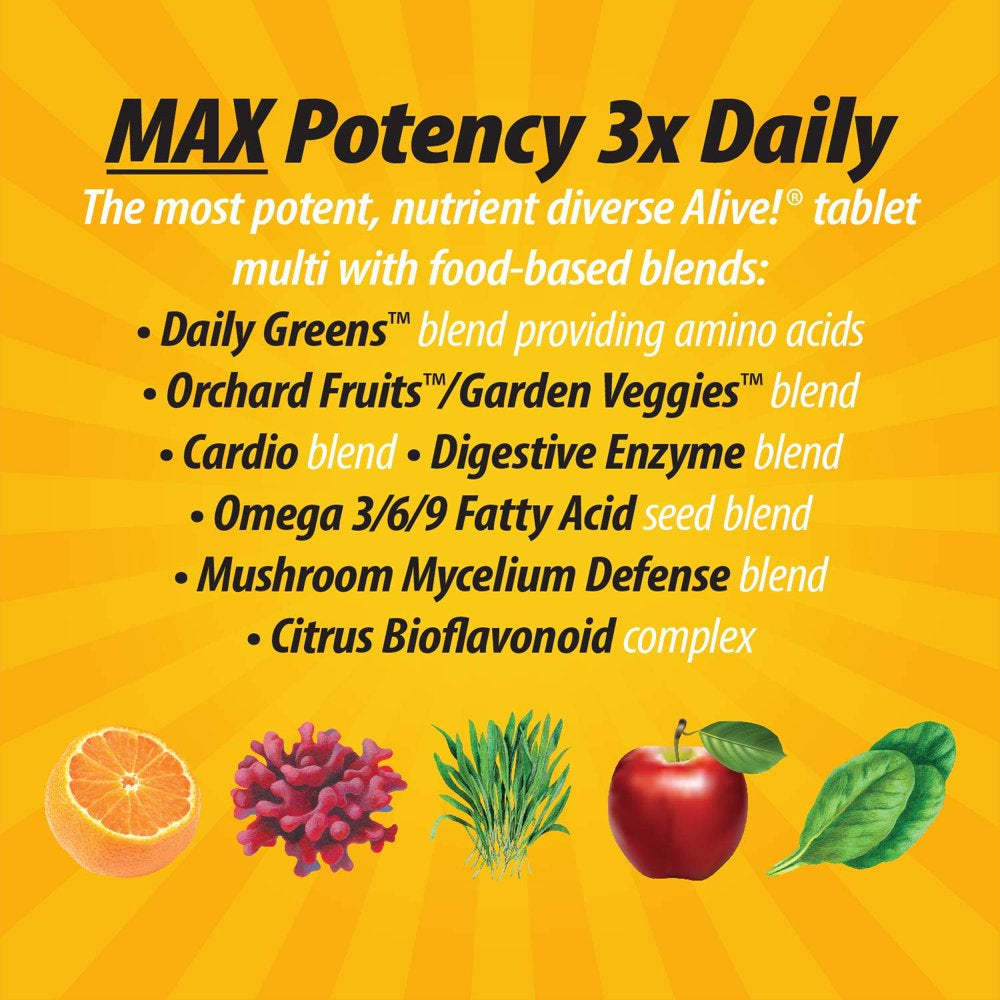 | Features | Antioxidants: Vitamin C, Vitamin E, beta carotene, and selenium, Our Max Potency Multivitamin - with no iron added!, It's also packed with high potency B-vitamins to help convert food into energy*, Orchard Fruits/ Garden Veggies powder blend������(200 mg per serving), and nutrients to help support bone health, daily energy, eye health, heart health, and immune health, Available in-������30������|������60������|������90������|������180������Tablets, Alive! MAX Potency (no iron added) contains������a diversity of daily essentials, greens, phytonutrients and antioxidants. |