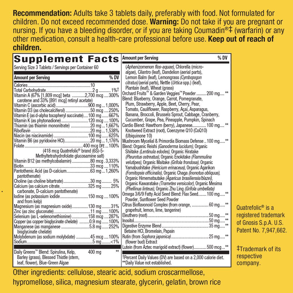 Vitamin A (67% [10,000 IU] as beta carotene, 33% [5,000 IU] as retinyl acetate), Vitamin C (ascorbic acid), Vitamin D3 (as cholecalciferol), Vitamin E (as d-alpha tocopheryl succinate), Vitamin K1 (as phytonadione), Thiamin (as thiamin mononitrate), Riboflavin (Vitamin B2), Niacin (as niacinamide), Vitamin B6 (as pyridoxine HCl/pyridoxal 5-phosphate), Folic Acid, Vitamin B12 (as cyanocobalamin), Biotin, Pantothenic Acid (as d-calcium pantothenate), Calcium (as carbonate/citrate/pantothenate), Iodine (as potassium iodide and from kelp powder), Magnesium (as magnesium oxide, magnesium citrate), Zinc (as zinc gluconate), Selenium (as L-selenomethionine), Copper (as copper bisglycinate chelate), Manganese (as manganese bisglycinate chelate), Molybdenum (as sodium molybdate), Sodium, Potassium (as potassium citrate), Daily Greens? Blend providing Amino Acids Spirulina, Kelp, Alfalfa (leaf, stem), Barley Grass, Blessed Thistle (stem, leaf, flower), Blue Green Algae (Aphanizomenon flos-aquae), Chlorella, Cilantro (leaf), Dandelion (leaf), Lemon Balm (leaf), Lemon Grass, Nettle (leaf), Plantain (leaf), Wheat Grass, Orchard Fruits? / Garden Veggies? Blend Blueberry, Orange, Carrot, Pomegranate, Plum, Strawberry, Apple, Beet, Tart Cherry, Pear, Tomato, Cauliflower, Raspberry, Açaí, Asparagus, Banana, Broccoli, Brussels Sprout, Cabbage, Cranberry, Cucumber, Grape, Pea, Pineapple, Pumpkin, Spinach; Cardio Blend Hawthorn (berry), Japanese Knotweed (root) standardized to 50% resveratrol (5 mg), Coenzyme Q10 (ubiquinone); Digestive Enzyme Blend Concentrated enzyme formula (Protease I, Protease II, Amylase, Lactase, Peptidase, Cellulase, Invertase, Alpha Galactosidase, Lipase), Betaine HCl, Bromelain, Papain; Omega 3/6/9 Fatty Acid Seed Blend Flax Seed Powder, Sunflower Seed Powder, Organic Mushroom Mycelium Defense Blend Reishi (Ganoderma lucidum), Shiitake (Lentinula edodes), Oyster Hiratake (Pleurotus ostreatus), Enokitake (Flammulina velutipes), Maitake (Grifola frondosa), Yamabushitake (Hericium erinaceus), Agarikon (Fomitopsis officinalis), Chaga (Inonotus obliquus), Himematsutake (Agaricus brasiliensis/blazei), Kawaratake (Trametes versicolor), Mesima (Phellinus linteus), Zhu Ling (Grifola umbellata), Citrus Bioflavonoid Complex (from orange, grapefruit, lemon, lime, tangerine) providing: Hesperidin, Naringin, Narirutin, Eriocitrin, Flavonols and Flavones, Inositol, Siberian Eleuthero (Eleutherococcus senticosus) (root), Choline (as choline bitartrate), Rutin (Sophora japonica) flower bud extract, Lutein (from marigold), vegetable cellulose, vegetable stearic acid, vegetable modified cellulose gum, vegetable modified cellulose, silica, vegetable magnesium stearate, vegetable glycerin/div>