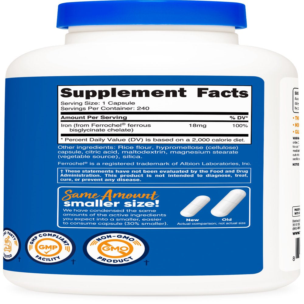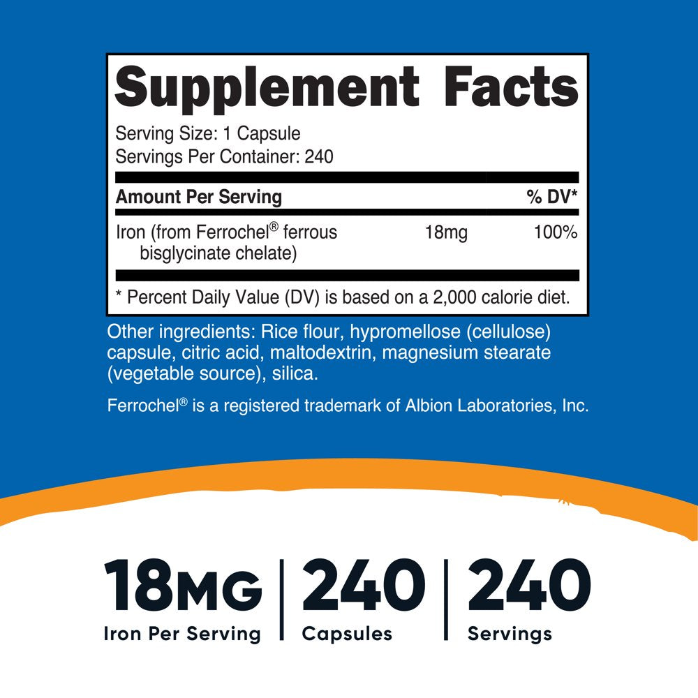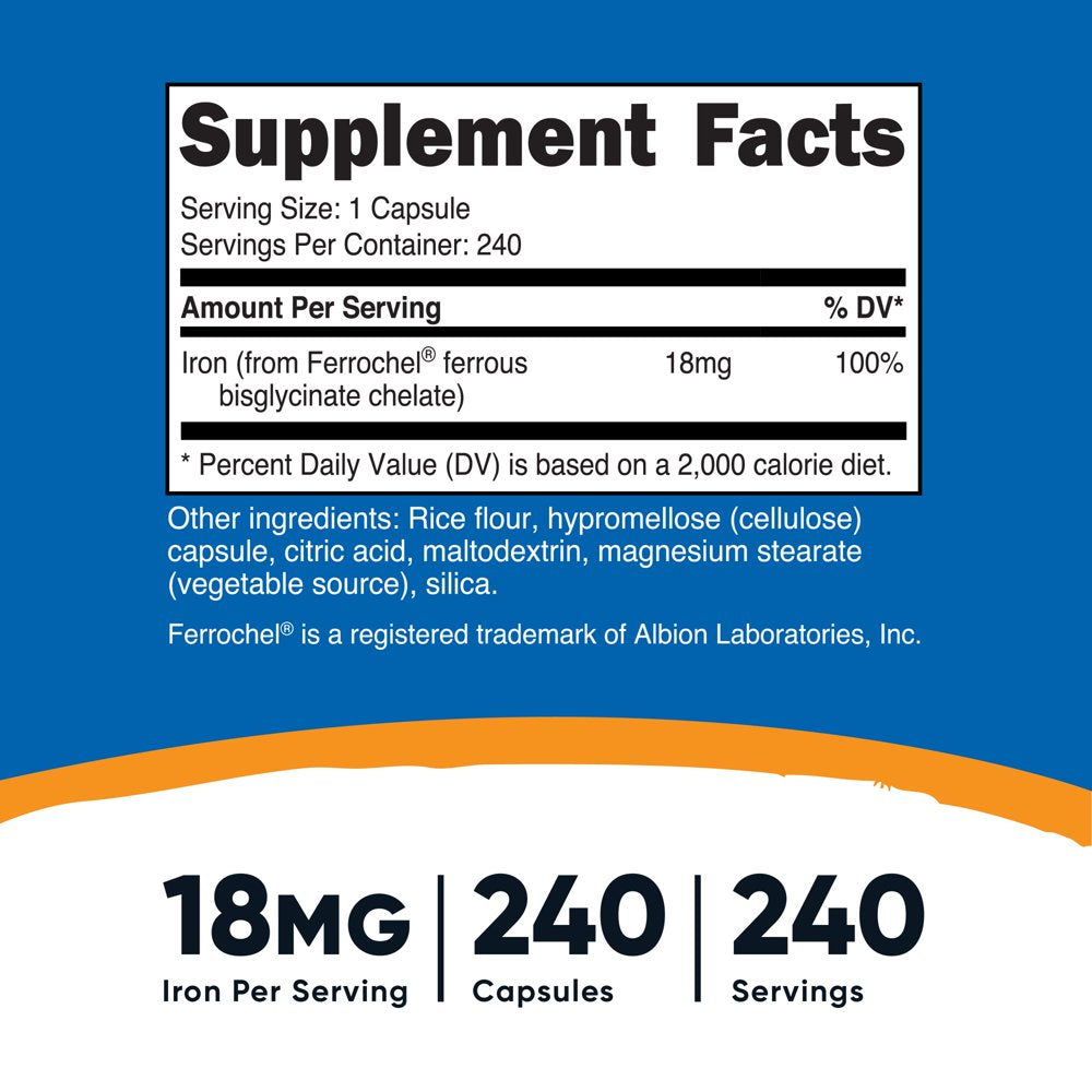 Nutricost Iron Supplement from Ferrochel Ferrous Bisglycinate Chelate, 18Mg, 240 Capsules