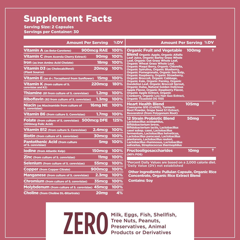 Multifood Whole Food Multivitamin for Women with Probiotics, Organic Fruits & Vegetables, Iron, CoQ10, Turmeric, Resveratrol & Prebiotic Fiber | Vegan Formula for Energy, Brain, Heart & Eye Health