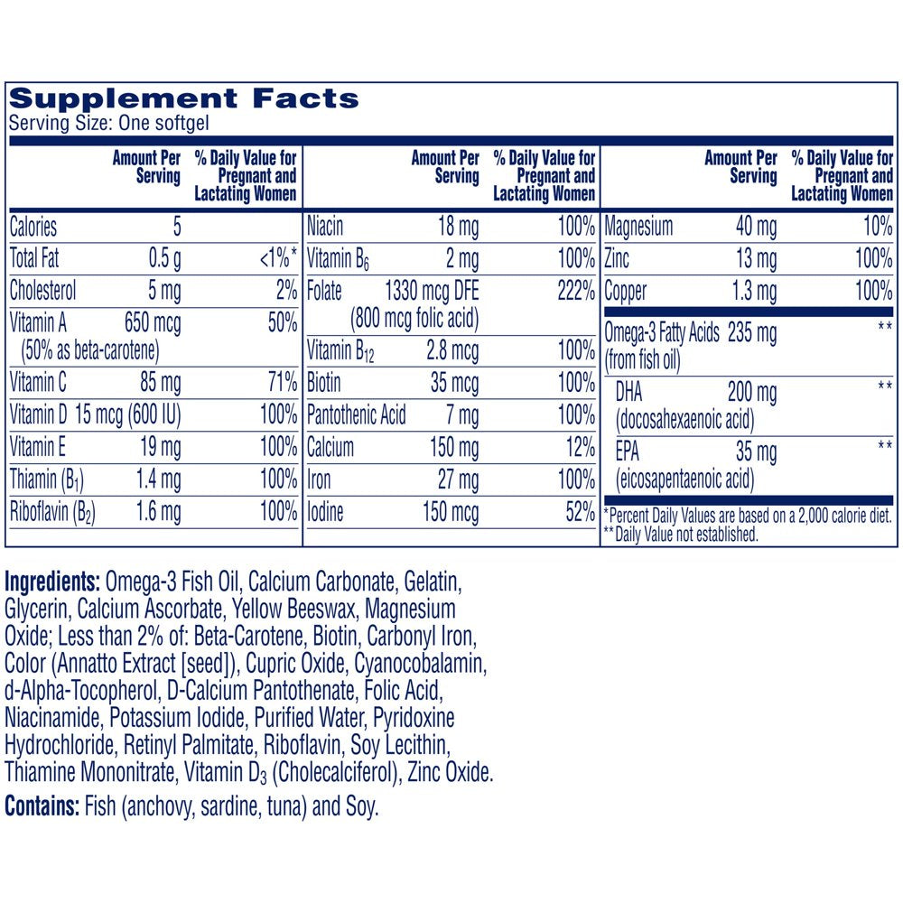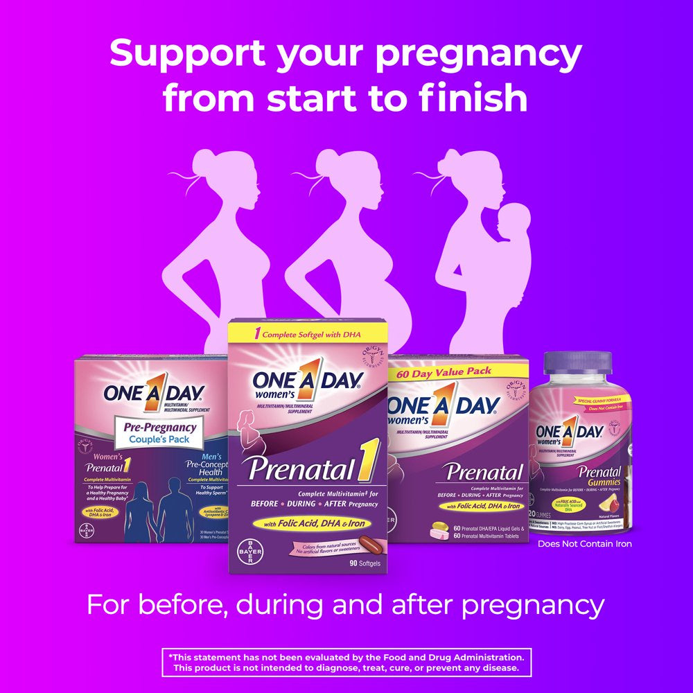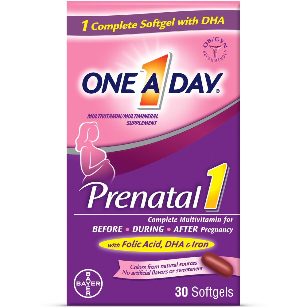 One A Day Women's Prenatal 1 is a complete Prenatal multivitamin that offers a wide variety of key nutrients in an easy-to-take Softgel designed for women through every stage of pregnancy. Adding a Prenatal multivitamin to your daily routines is an important step in providing nutritional support for pregnant women and babies throughout pregnancy and breastfeeding. This daily Prenatal multivitamin contains key nutrients such as Folic Acid, Omega-3 DHA, Calcium, Vitamin D, and Iron. DHA is an Omega-3 fatty acid that can help support healthy fetal brain and eye development.* This easy-to-take Softgel supports the earliest and most critical stages of pregnancy, and it is commonly recommended to begin a Prenatal vitamin routine before you get pregnant. One A Day Women's Prenatal multivitamins are the #1 OB/GYN recommended over the counter brand of Prenatal multivitamins. One A Day Multivitamins can provide nutritional support that you and your growing family may need at every life stage.