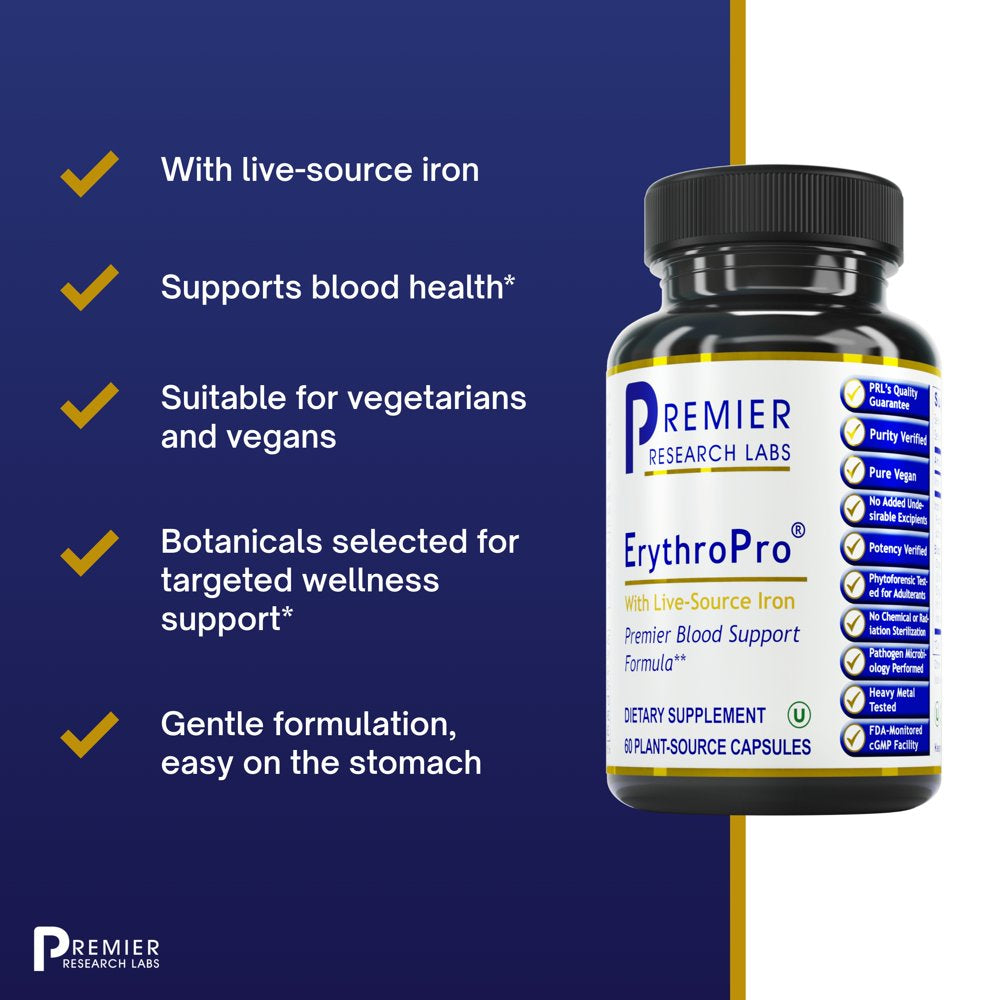 Premier Research Labs Erythropro with Live-Source Iron - Features Pumpkin Seed, Organic Oat, Beet, Chlorella, Rice Bran, Tomato & Bilberry - Blood Support Formula - 60 Plant-Sourced Capsules