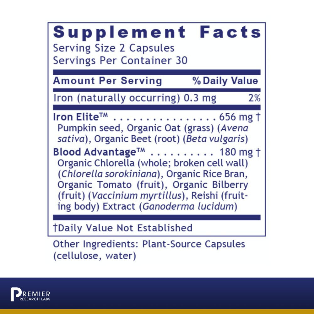 Premier ErythroPro is a premier quality blood support formula that features live-source iron and provides two important key blends for optimal nutritional support. The two key blends contain pumpkin seed, organic oat, organic beet, organic chlorella, organic rice bran, organic tomato, organic bilberry and reishi extract. Premier ErythroPro does not contain inorganic iron such as ferrous fumarate. This formula is also suitable for vegans. Take 2 capsules daily or as directed by a health professional.
