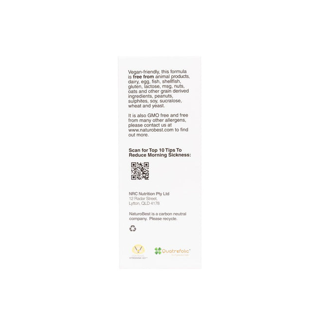 - VEGAN-FRIENDLY - Looking for quality first trimester essentials? Our vegan pregnancy vitamins are free from animal products, soy, dairy, egg, fish/shellfish, gluten, lactose, MSG, nuts, oats and other grain-derived ingredients, peanuts, sulphites, sucralose, wheat, yeast, magnesium stearate, stearic acid, and artificial colours, flavours, and preservatives.