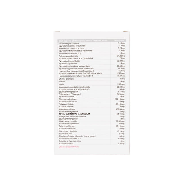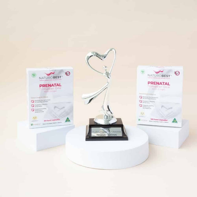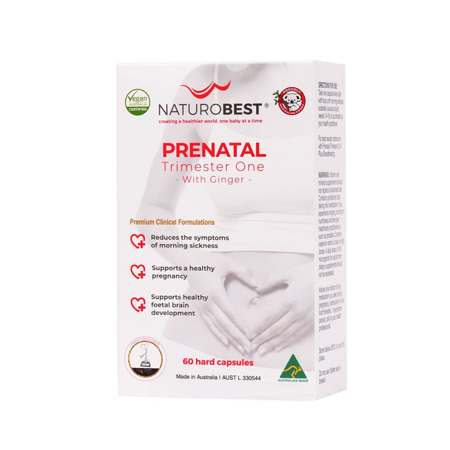 Cover your trimester one nutritional needs with NATUROBEST Prenatal Trimester One, a prenatal vitamin and mineral supplement which supports normal, healthy foetal development as well as nausea relief for pregnant women with the addition of 75mg of vitamin B6 and 1300mg of ginger. Providing only activated forms of B vitamins including active folate, Prenatal Trimester One maintains healthy foetal development. Our vegan-friendly pregnancy morning sickness relief supplement is free from common allergens and artificial ingredients. It does not contain copper, levels of which rise naturally during pregnancy making copper supplementation unnecessary. It also does not contain iron, which may aggravate the symptoms of morning sickness. Seek advice from your health professional if you are iron deficient. Always read the label and follow the directions for use. Take one capsule two times daily with food (preferably breakfast and lunch). Remember, vitamin supplements should not replace a balanced diet. Prenatal Trimester One contains selenium. A daily dose of 150 micrograms for adults of selenium from dietary supplements should not be exceeded. Ensure a healthy pregnancy with NATUROBEST Prenatal Trimester One with Ginger