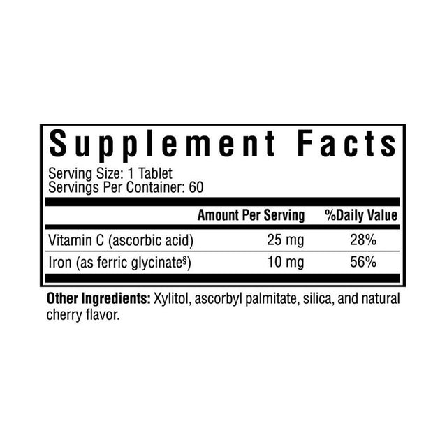 Vitamin C (ascorbic acid) 25 mg, Iron (as ferric glycinate) 10 mg. Other Ingredients: Xylitol, ascorbyl palmitate, natural cherry flavor, and silica./div>
