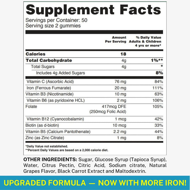 Each bottle contains 100 delicious chewable grape-flavored iron gummies (45 days).