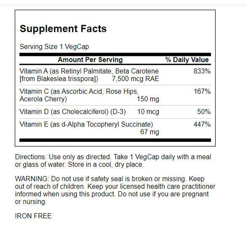 Because living your best life means feeling your best, our Once Daily High Energy Multivitamin is packed with essential vitamins and minerals and helps support both a healthy immune system as well as higher daily energy levels. Made for those who get enough iron in their diet, our iron-free multivitamin contains 100% DV or more of vitamin A, vitamin C, vitamin D, vitamin E, B vitamins and more in each 1-VegCap serving. And with a Whole Food and Herb Base including alfalfa, dandelion, kelp, and more, you won’t find a higher quality multi vitamin.