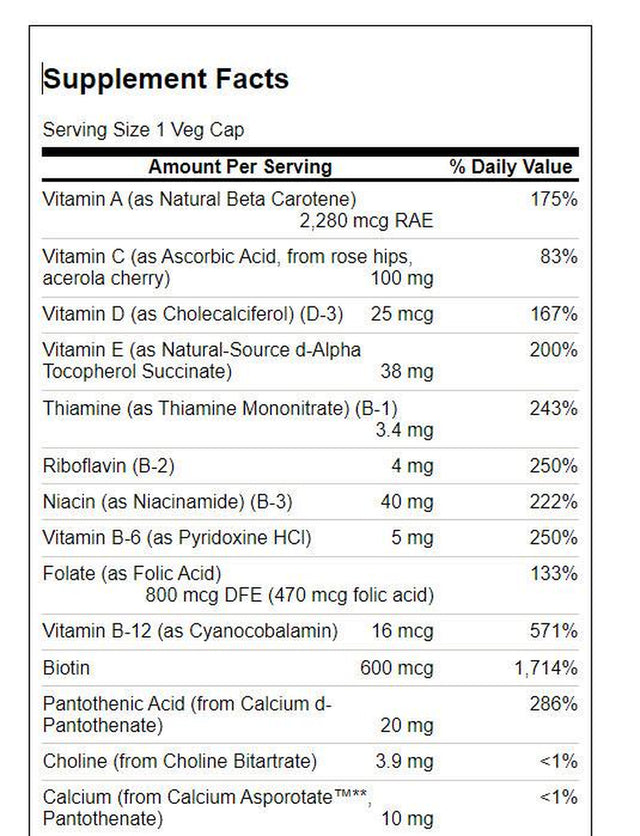 Just one capsule provides 100% DV of most essential vitamins, plus chelated minerals in a whole food base of broccoli, carrot, tomato and more. Our once-daily prenatal multivitamin with DHA and Folic Acid is formulated to help support healthy fetal spinal cord growth and normal, healthy eye and brain development – support that may continue after your baby’s birth while you’re breastfeeding. Finally, our proprietary Morning Ease Blend may calm the stomach and support healthy digestion with Ginger, Peppermint, and Red Raspberry Leaf.