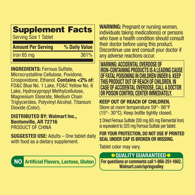 - Spring Valley Iron General Wellness Dietary Supplement Tablets, 65 mg, 100 Count