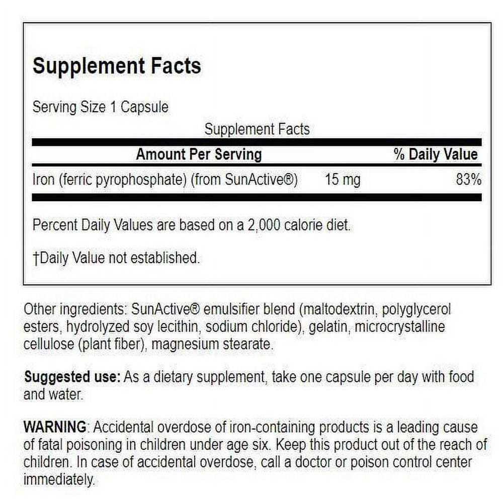 Iron (ferric pyrophosphate) (from SunActive) 15 mg 83%, SunActive emulsifier blend (maltodextrin, polyglycerol esters, hydrolyzed soy lecithin, sodium chloride), gelatin, cellulose, magnesium stearate./div>