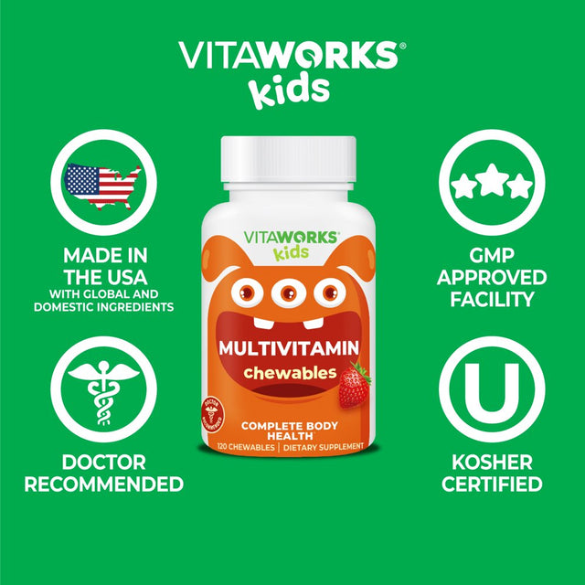 • NATURALLY FLAVORED AND VEGETARIAN: These vegetarian multivitamins for kids chewable tablets are certified non-GMO, gluten-free, and dairy-free. They are free of peanuts and tree nuts and they are made with natural flavors and colors. Kosher and Halal. VitaWorks kids chewables are made in the USA with global and domestic sourced ingredients.