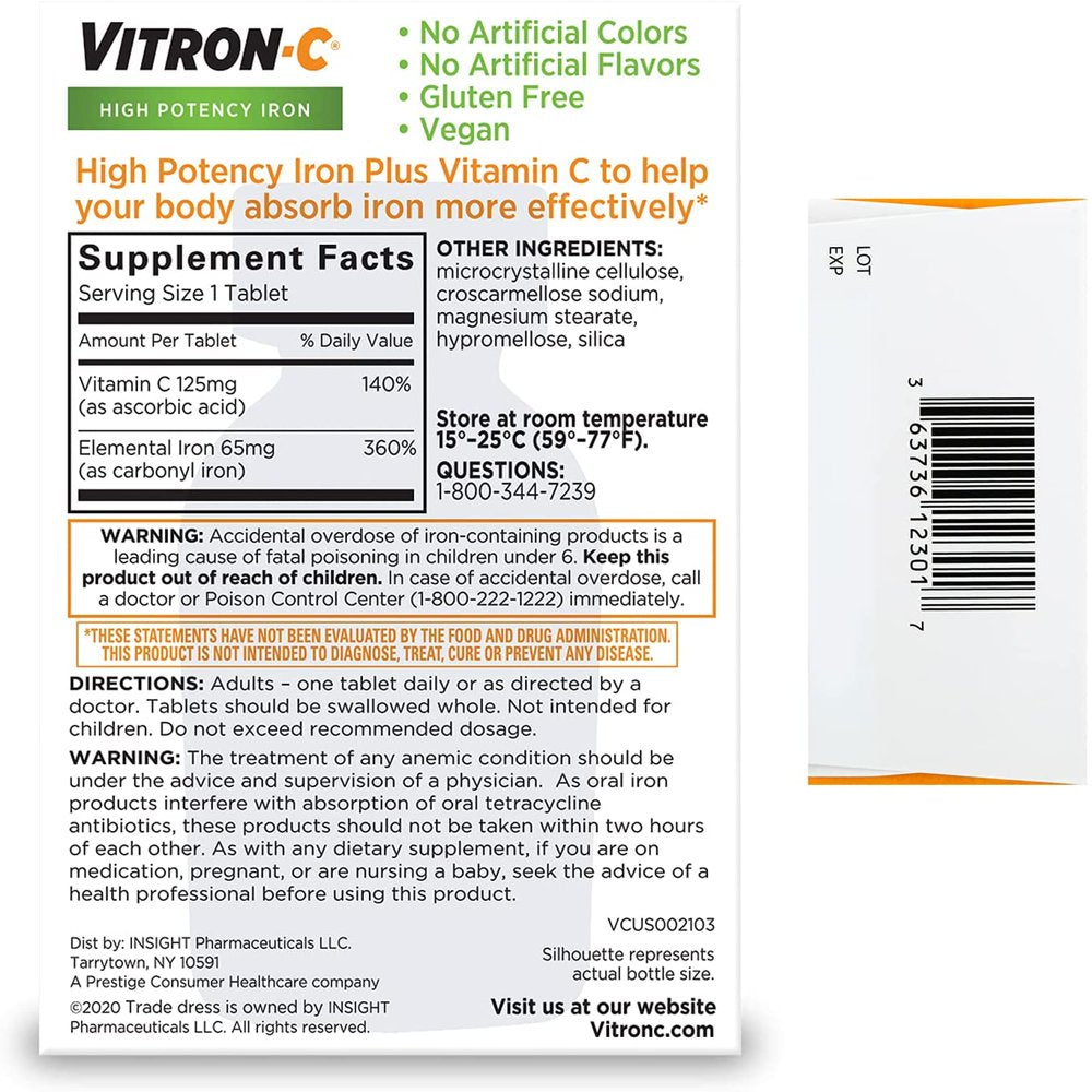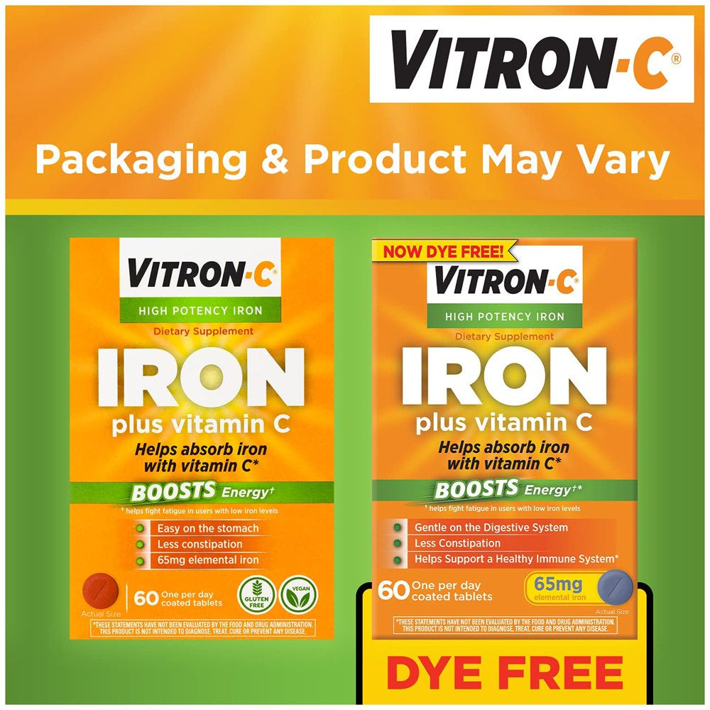 Contains 1 pack of Vitron-C High Potency Iron Supplement Plus Vitamin C, 60 tablets, packaging and product may vary