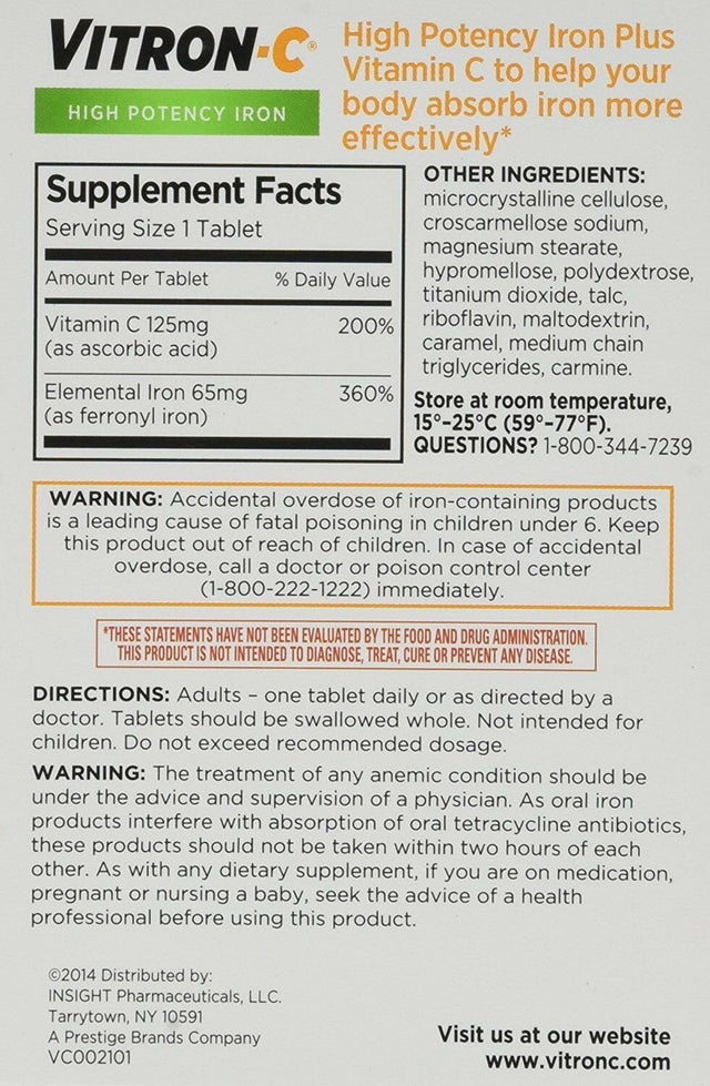 Vitron-c High Potency Iron Supplement Tablets 60 Ct (Pack of 2). (pack of 2) 755452. (pack of 2) 755452.
