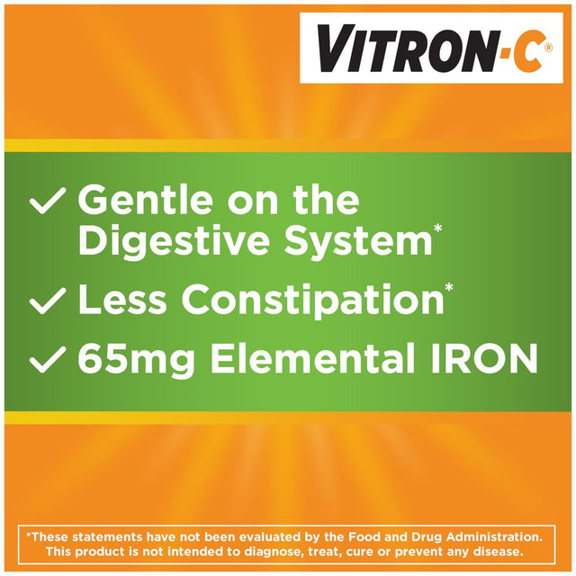 Vitron-C is a high potency iron supplement formulated with Vitamin C to help your body better absorb iron. The use of an iron pill daily may boost energy by helping to fight fatigue in users with low iron levels* or iron-deficiency anemia. Vitron-C iron supplement for women and men contains carbonyl iron which provides gradual and gentle iron absorption and helps minimize constipation*. The added Vitamin C improves iron absorption*. Vitron-C iron with Vitamin C supplement is dye free, gluten free and vegan. Iron deficiency is a common type of nutritional deficiency in the United States. Without enough iron, your body can't make enough hemoglobin, a substance that helps red blood cells carry oxygen from the lungs to the body's tissues. Hemoglobin also helps our muscles store and use oxygen. Iron deficiency can affect many body functions. It can delay growth in children, stand in the way of our ability to do work as adults, cause problems during pregnancy and it can even cause heart problems, such as a rapid or irregular heartbeat. If your doctor advises that you have iron deficiency, talk to them about Vitron-C iron supplements. *These statements have not been evaluated by the Food and Drug Administration. This product is not intended to diagnose, treat, cure, or prevent any disease.