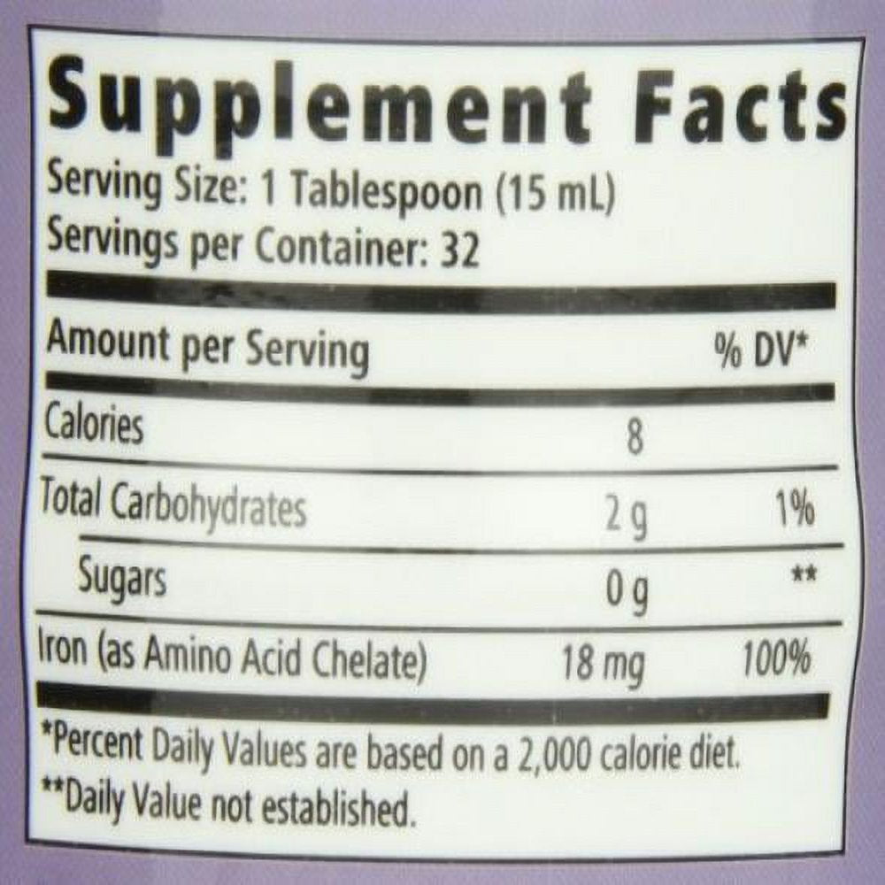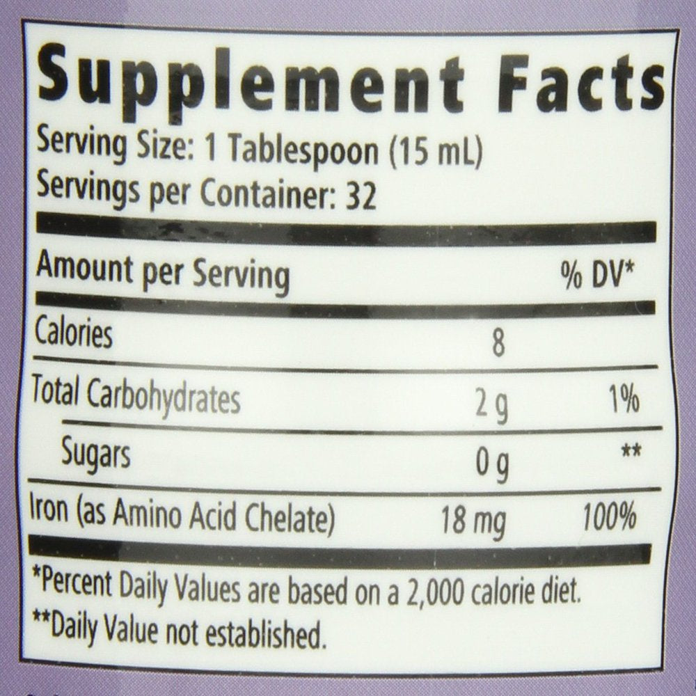 Liquid iron with 18 milligram provides an easy way to maintain 100% of your daily value of iron in just 1 measured tablespoon, once a day in a great tasting, naturally sugar free liquid supplement.