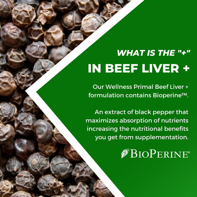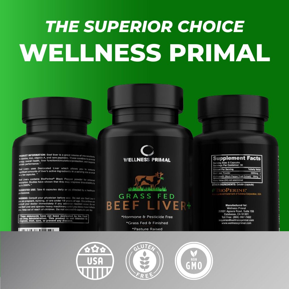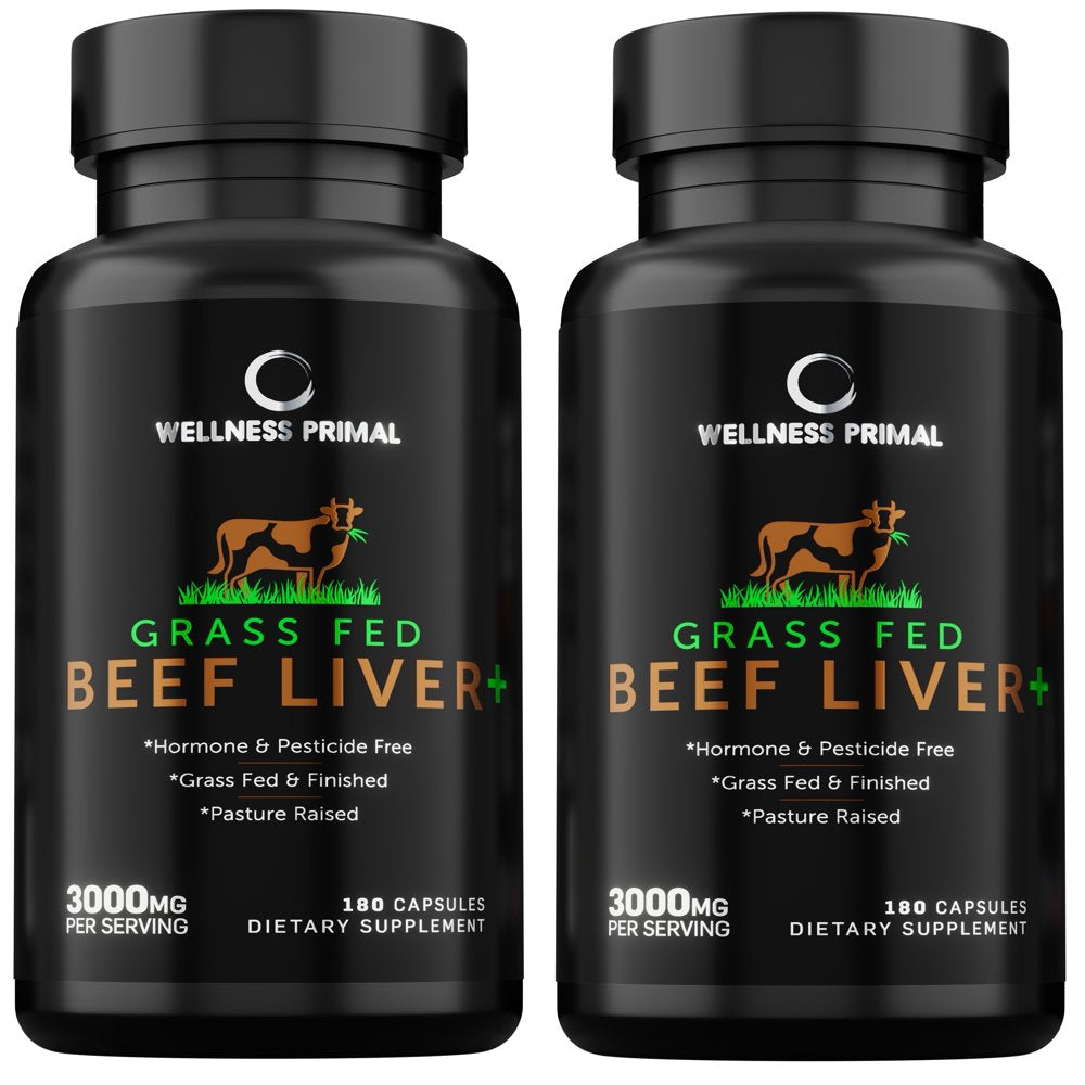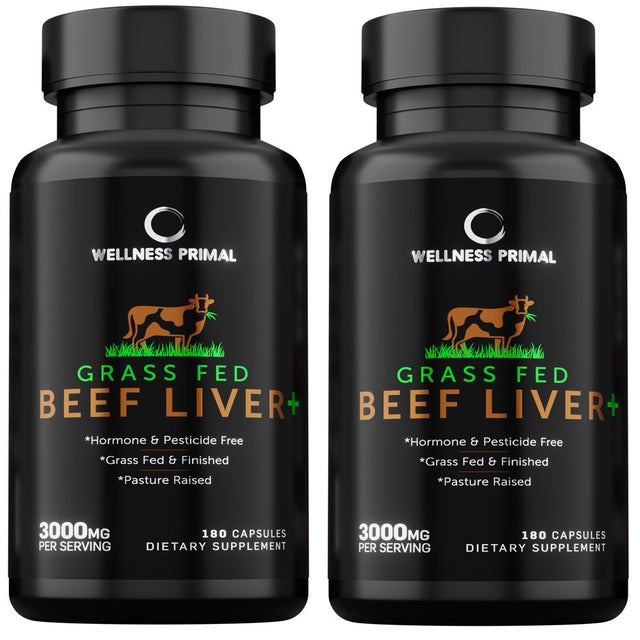 Wellness Primal Beef Liver plus Supplement (Desiccated) Grass Fed , Argentinian Raised Cattle Natural Iron, Vitamin A, B12 for Energy (180 Capsules) (2 Bottle)