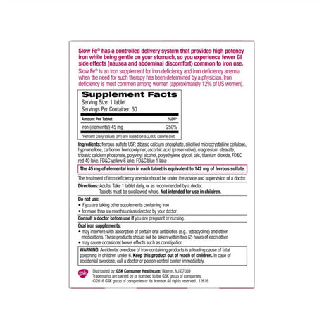 Slow Fe Iron Supplement for Iron Deficiency Slow Release Tablets, 45 Mg, 30 Ct