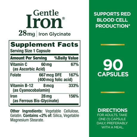 Nature'S Bounty Gentle Iron Glycinate 28 Mg Capsules, Supports Red Blood Cells, 90 Ct