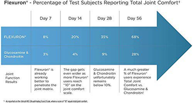 Clinical studies show that Flexuron helps alleviate normal joint discomfort associated with aging while also supporting normal joint comfort in healthy people.* Flexuron starts working in as little as 7 days, and tests have shown results that are on average 3 times better than products that rely on glucosamine and chondroitin.**