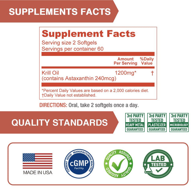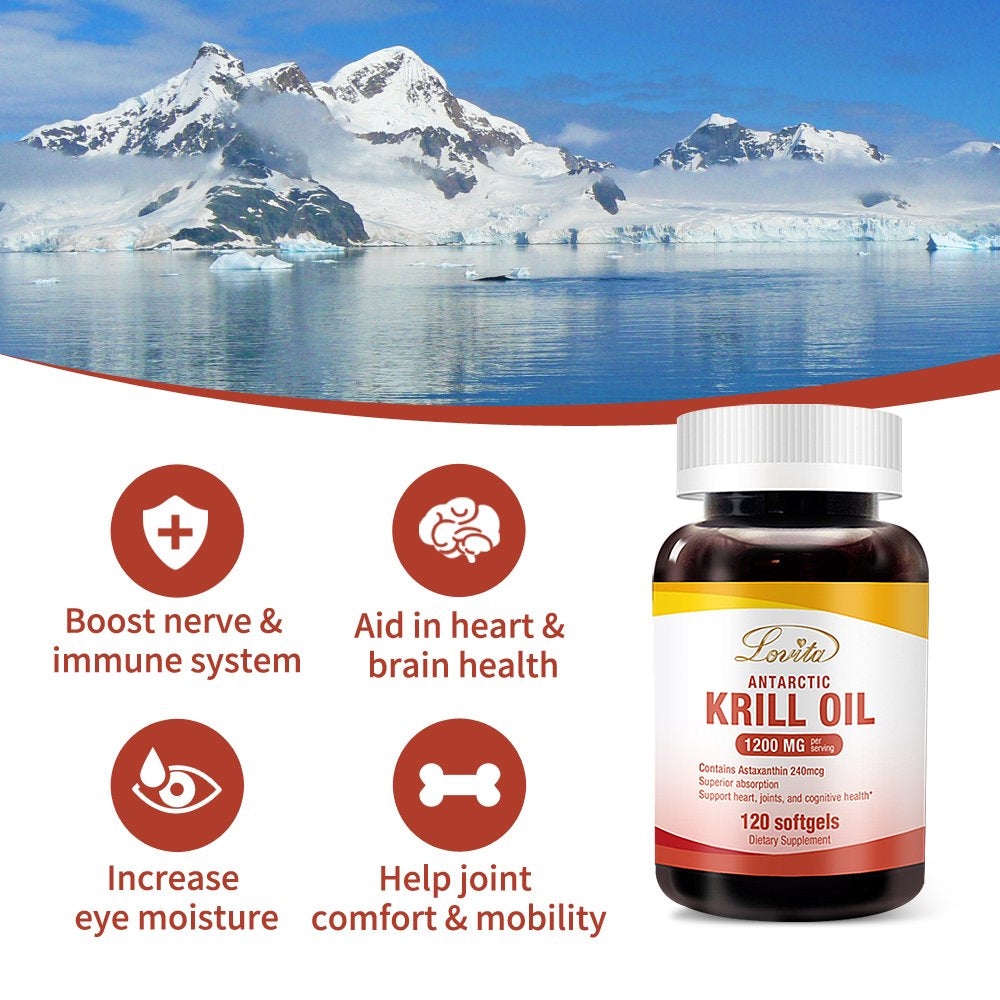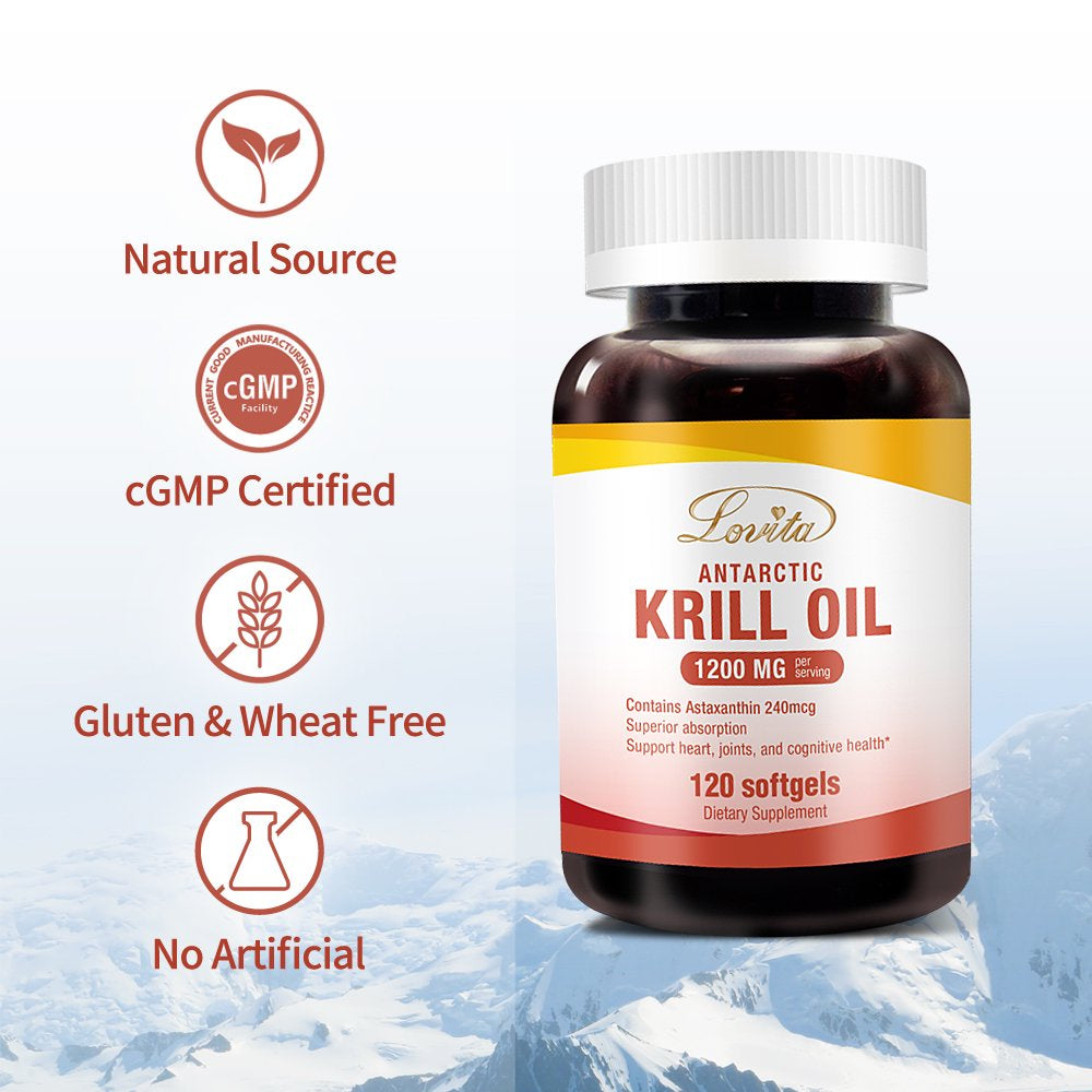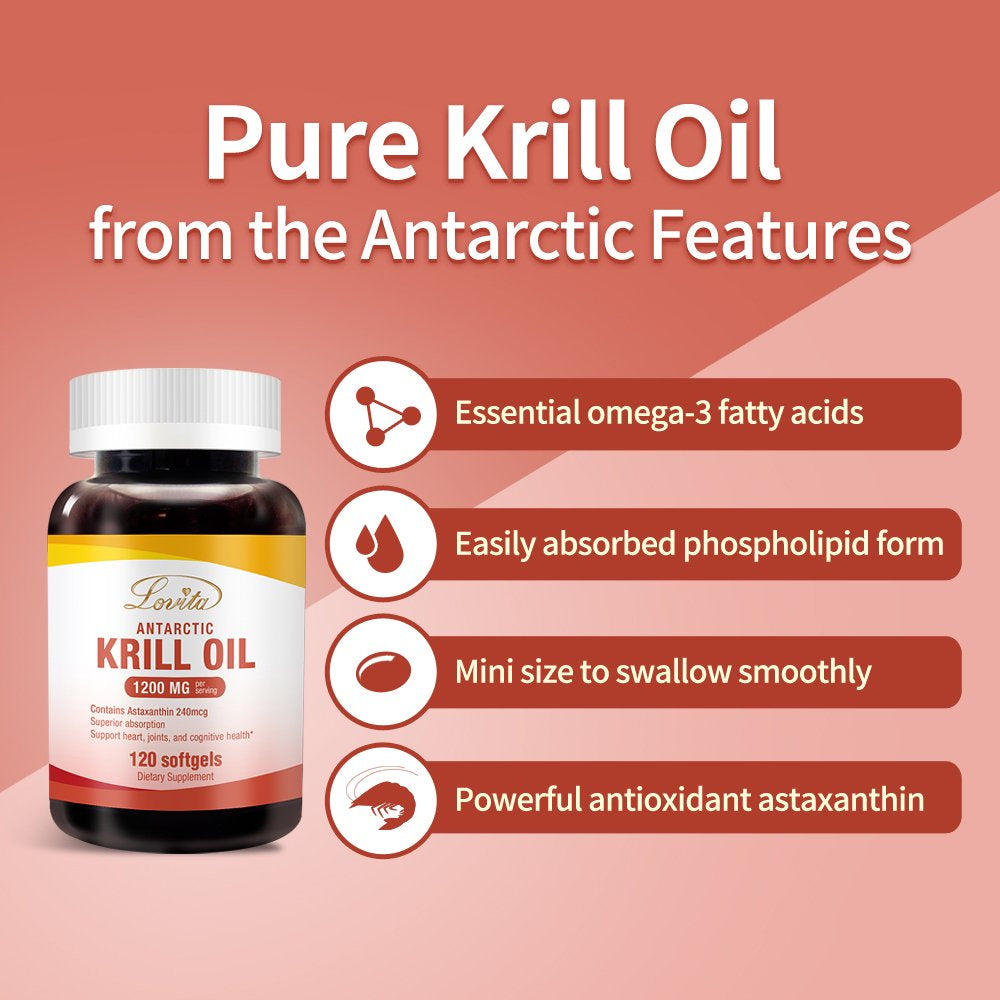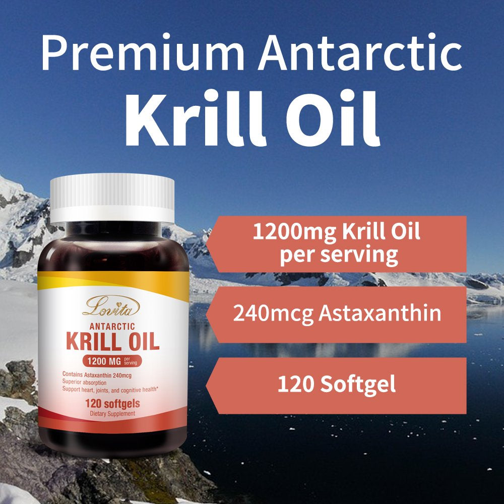 Lovita Krill Oil 1200Mg with Astaxanthin, EPA DHA Omega 3 Supplement, anti Inflammatory Supplement for Brain Booster, Joint Health and Cardiovascular Health, 120 Krill Oil Softgels