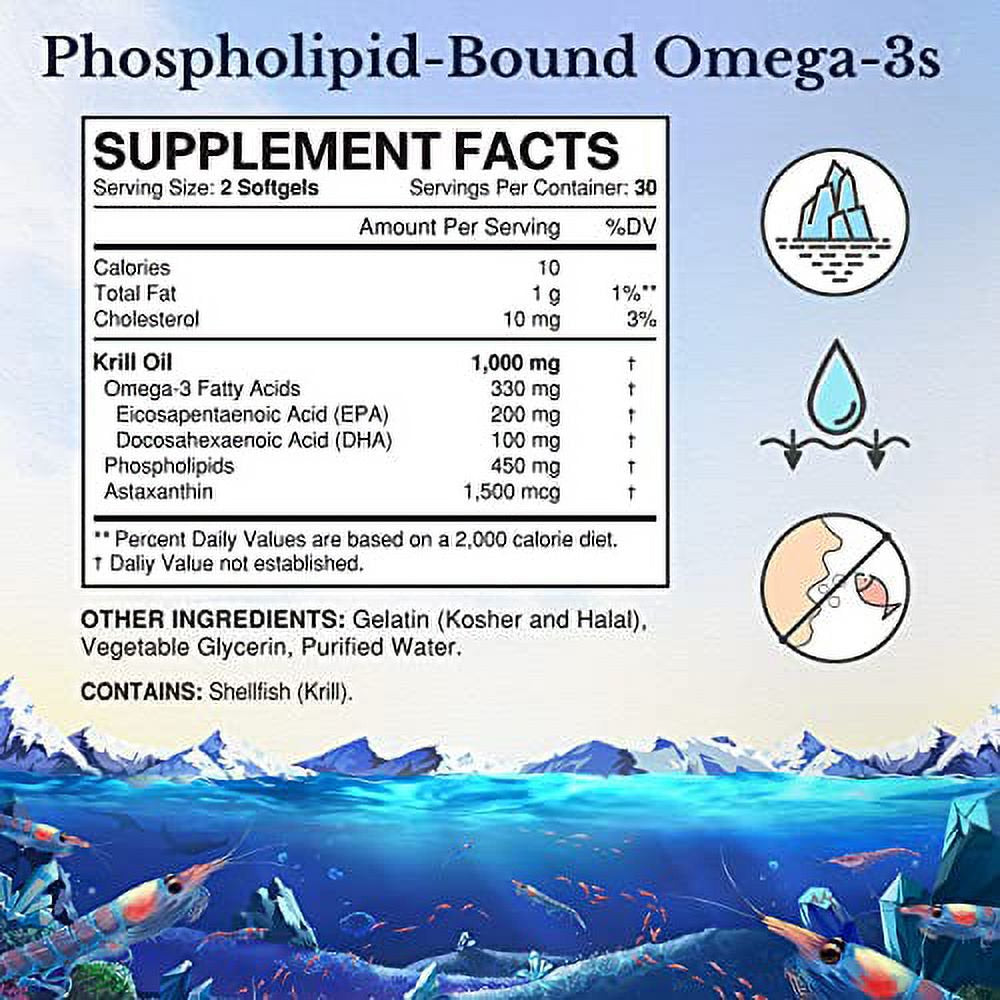 Vitalitown Antarctic Krill Oil 1000Mg, with Phospholipid-Bound Omega-3S EPA & DHA, Rich in Antioxidant Astaxanthin, No Fishy Odor or Aftertaste, Support Brain, Heart, Eye & Joint Health, 60 Softgels