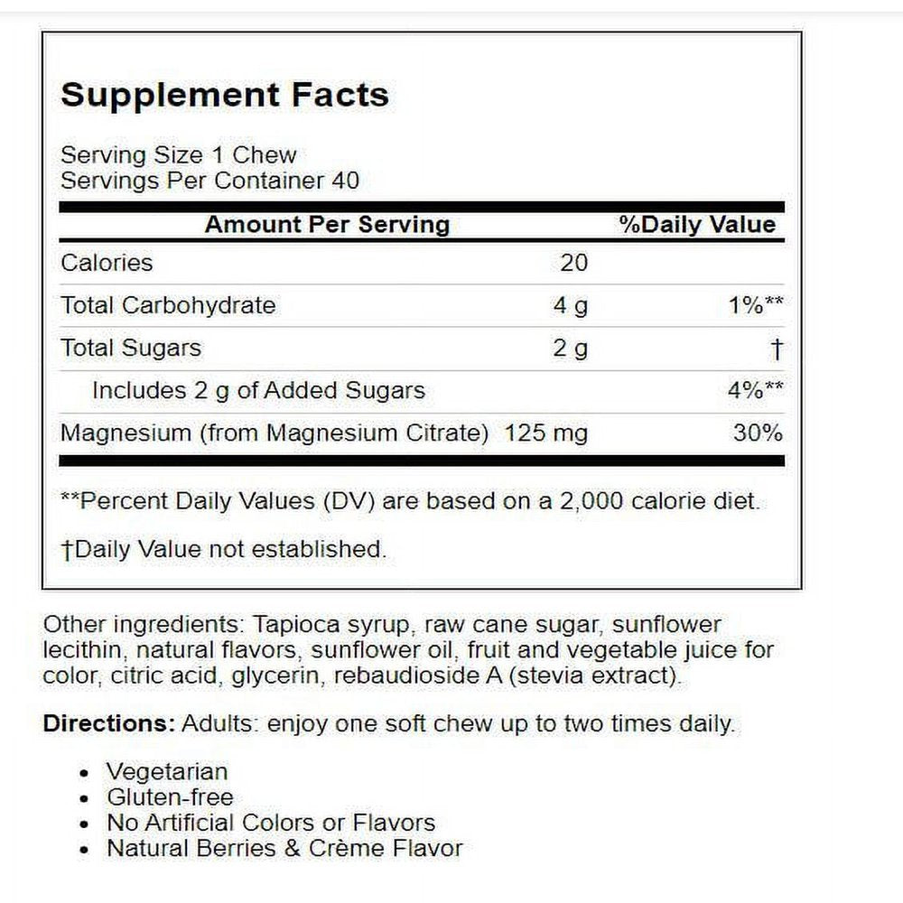 Magnesium plays an important role in more than 300 chemical reactions that keep our body functioning properly. It promotes cardiovascular health and muscle function, supports strong teeth and bones, helps to convert blood sugar into energy, and promotes a sense of calm and relaxation. Magnesium Soft Chews in delicious natural berries and creme flavor are made with magnesium citrate, a form of magnesium that's easily absorbed, gentle, and effective. The vegetarian-friendly formula makes it easy for us to get more magnesium in our daily diet. Magnesium Soft Chews are individually wrapped for convenience and freshness.